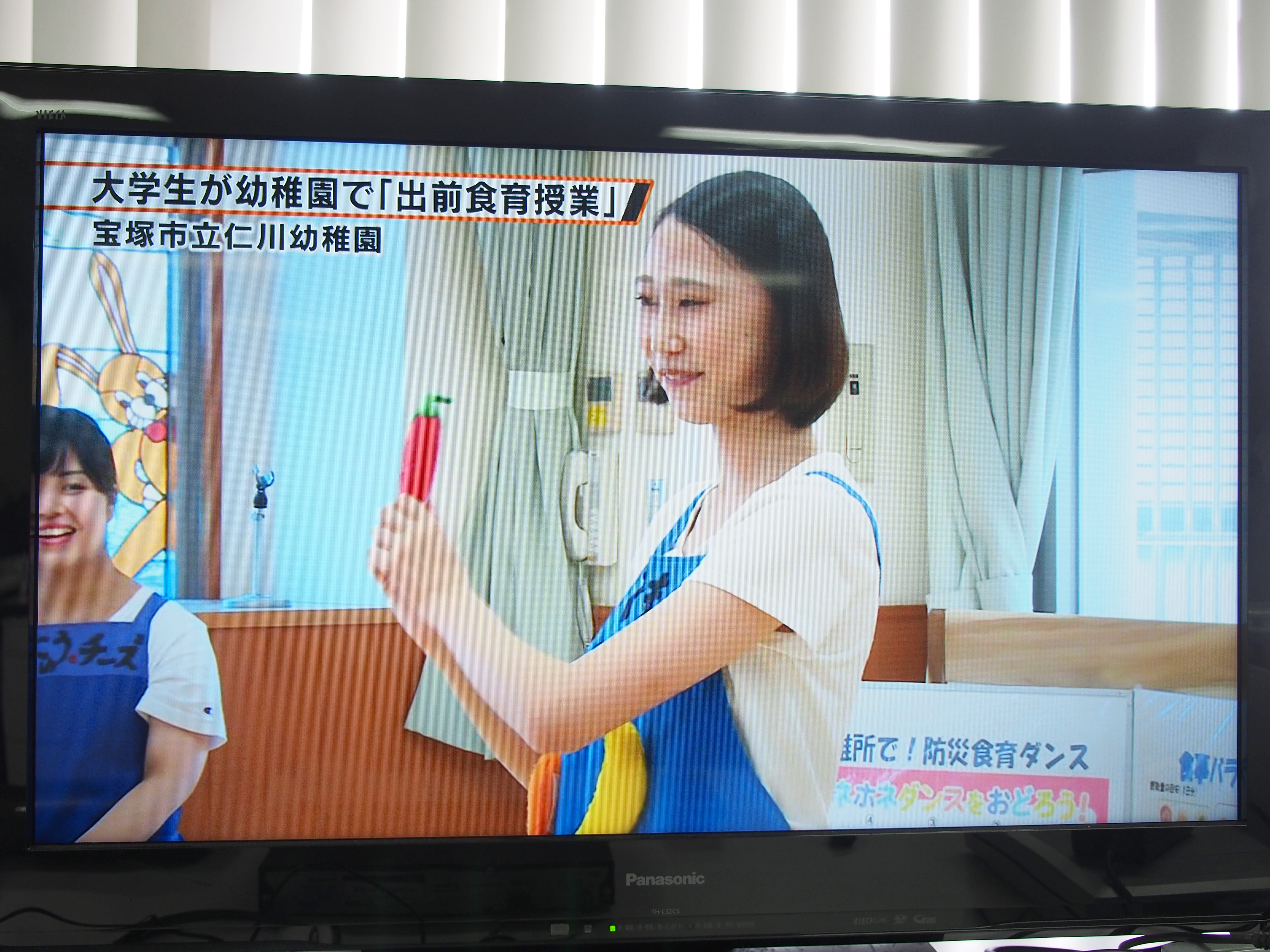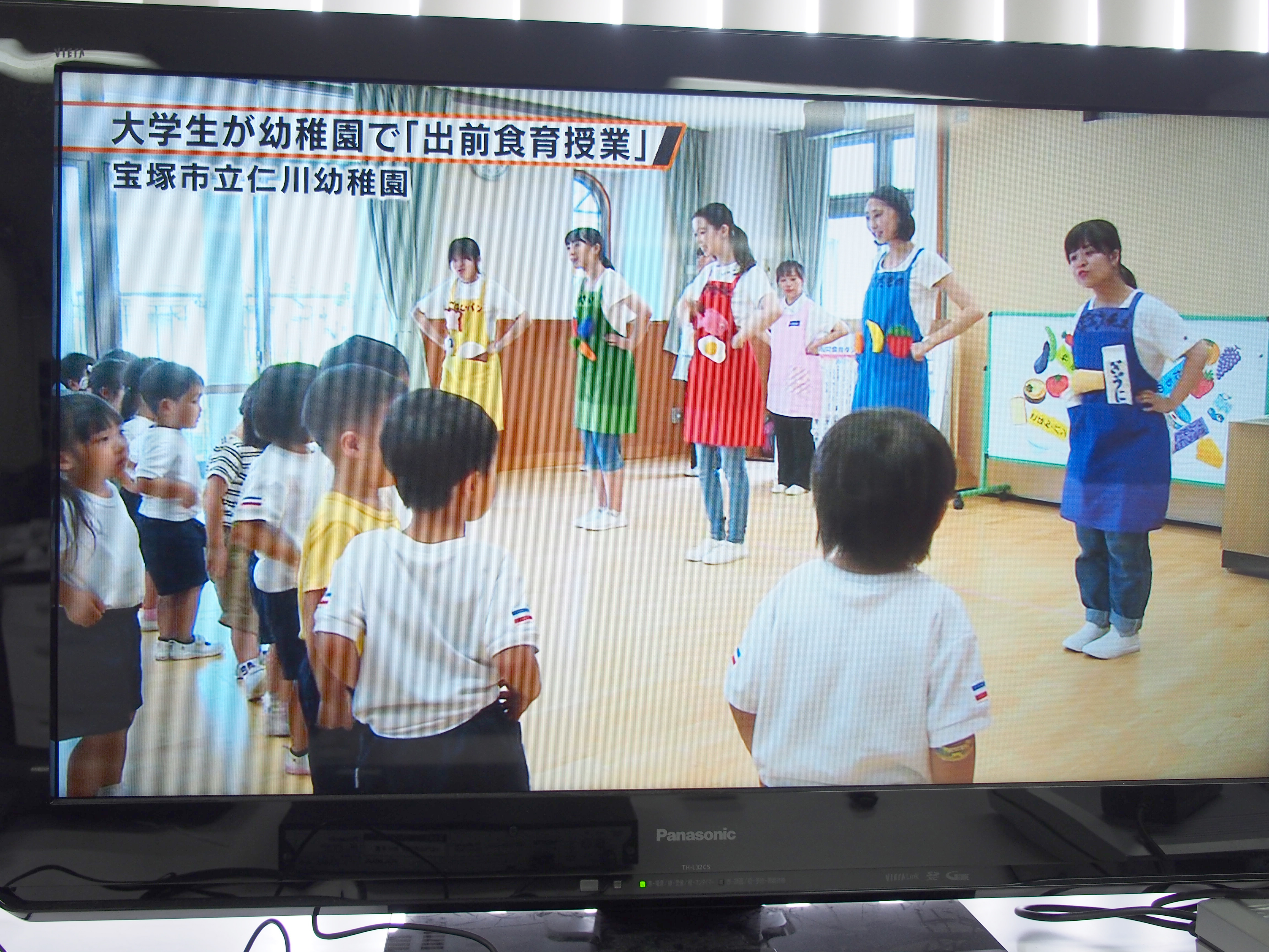 栄養学部栄養学科の学生10人と甲子園短期大学の学生3人が7月17日、宝塚市立仁川幼稚園で行った「出前食育授業」の模様が、ケーブルテレビの「J:COM」と「FM宝塚」で紹介されました。J:COMでは17日の「デイリーニュース」で、FM宝塚では20日の「Campus×Compass」で放送されました。仁川幼稚園の園児66人と、甲子園大学・甲子園短期大学が「食」を通して交流した様子が報道されました。