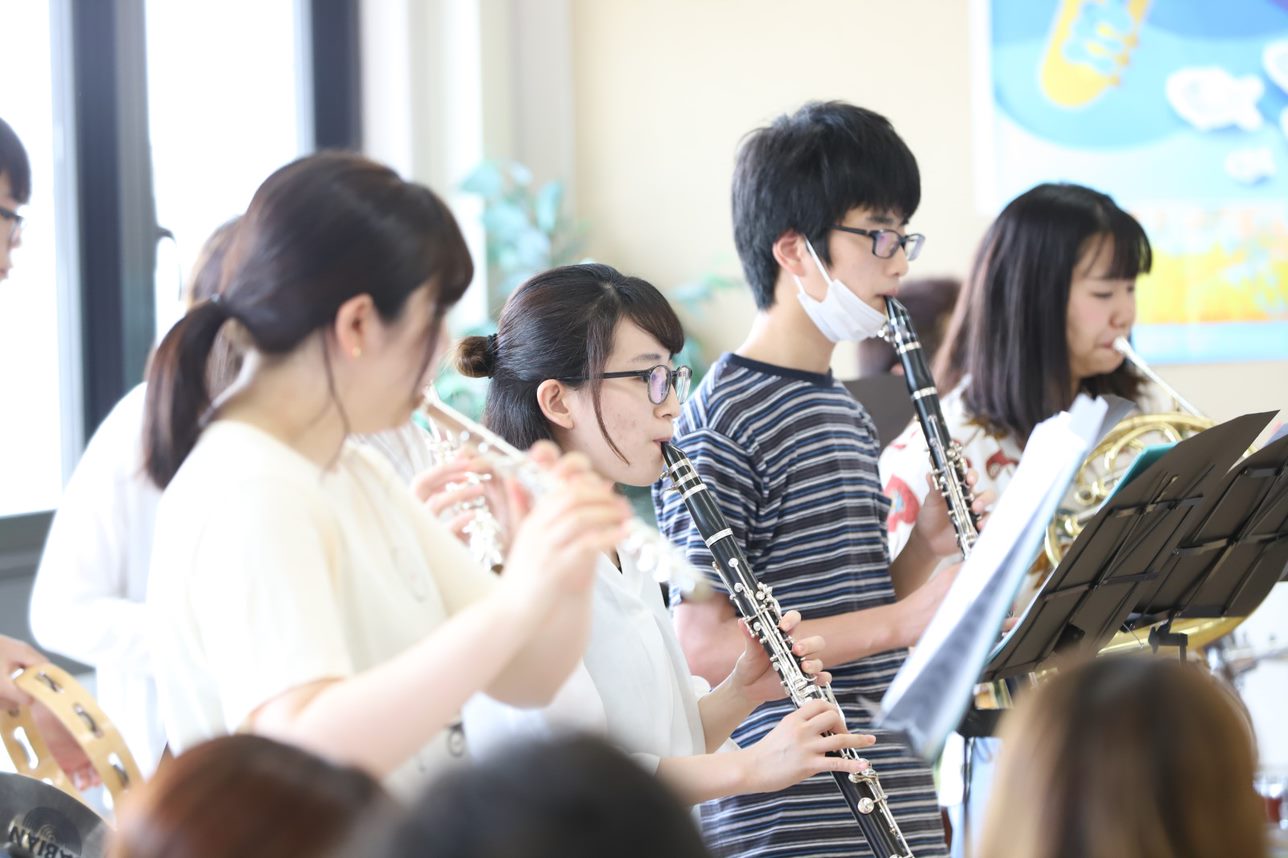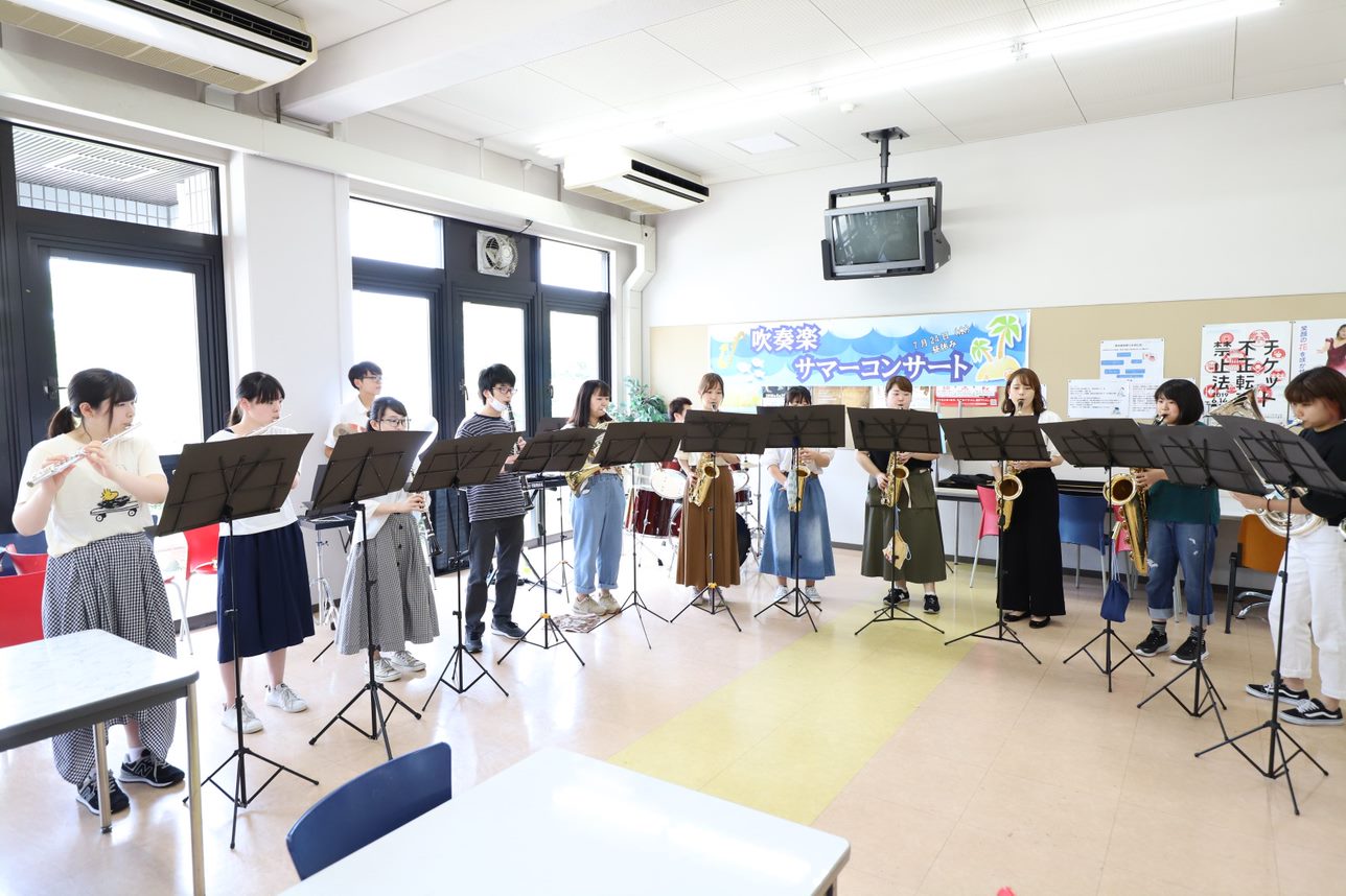 WHAT'S NEW2019.07.25 吹奏楽部がサマーコンサートを開催しました 7月25日昼休みに、本学吹奏楽部がサマーコンサートを開催しました。曲目は「明日も」「夏の童謡メドレー」「銀河鉄道999」の3曲。学生、教職員は昼食を食べながら、吹奏楽の演奏を楽しみました。 学内での次の演奏は8月24日のオープンキャンパス(昼食時、食堂)です。午前中には公開練習を実施していますので、ぜひ足をお運びください。 発信部署:事務局