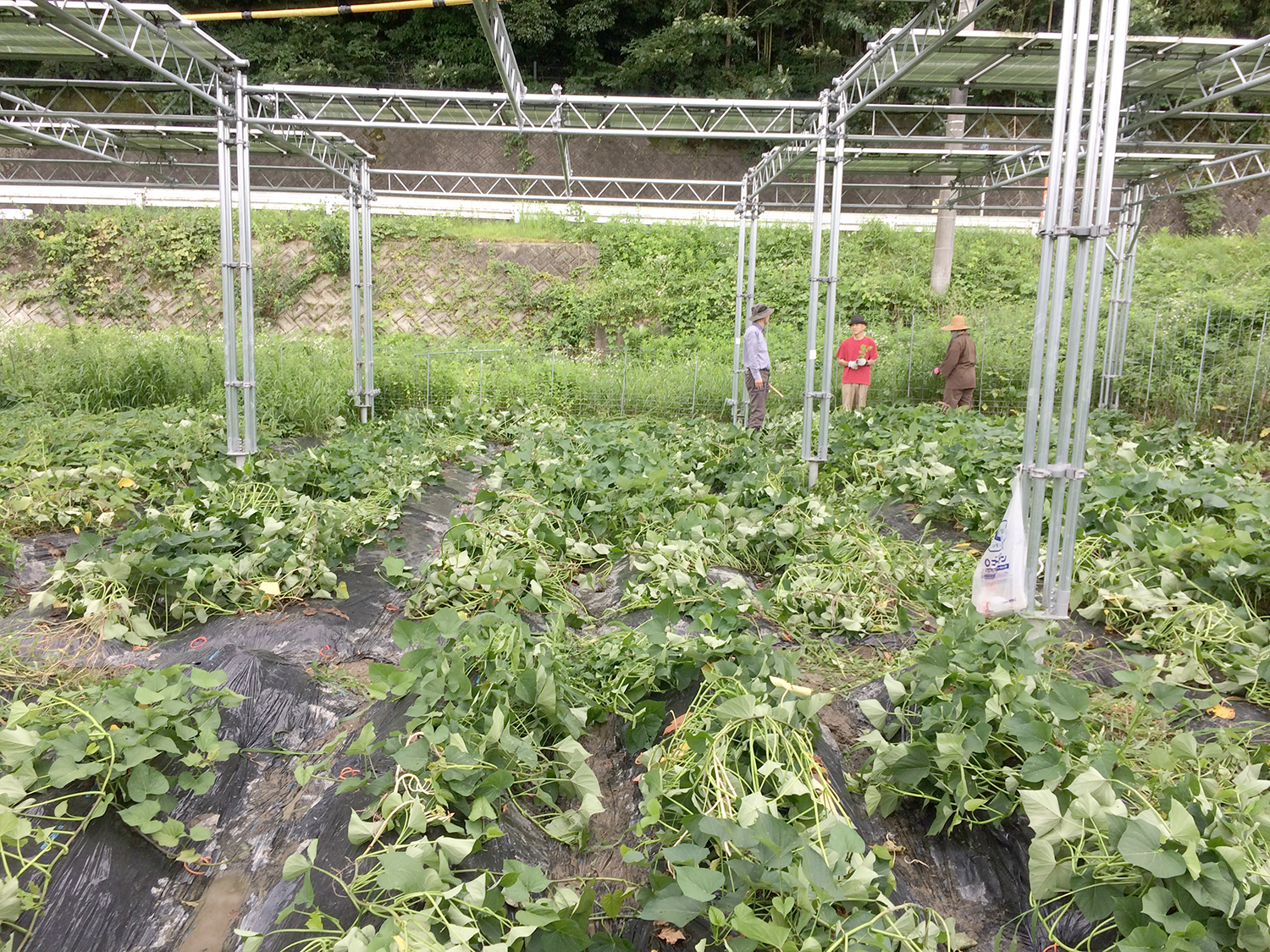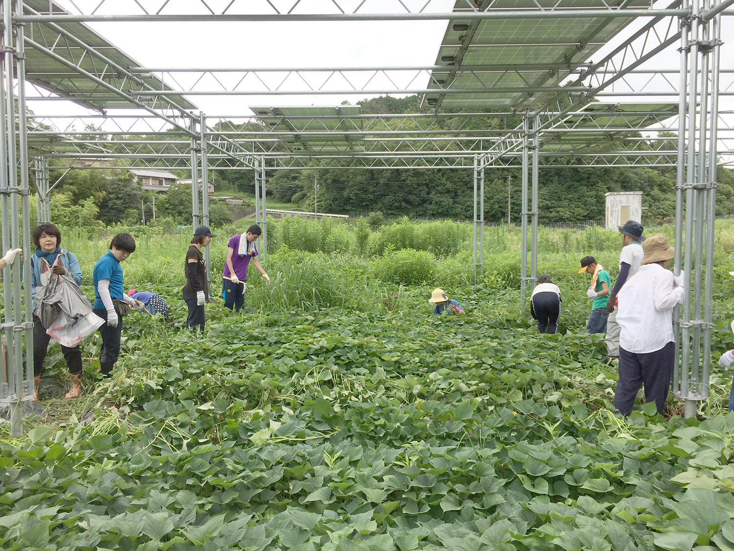 7月27日、曇り空のもと、西谷のソーラー農園で、草刈、はびこったツルをマルチのなかに戻す「つる返し」の作業を行いました。