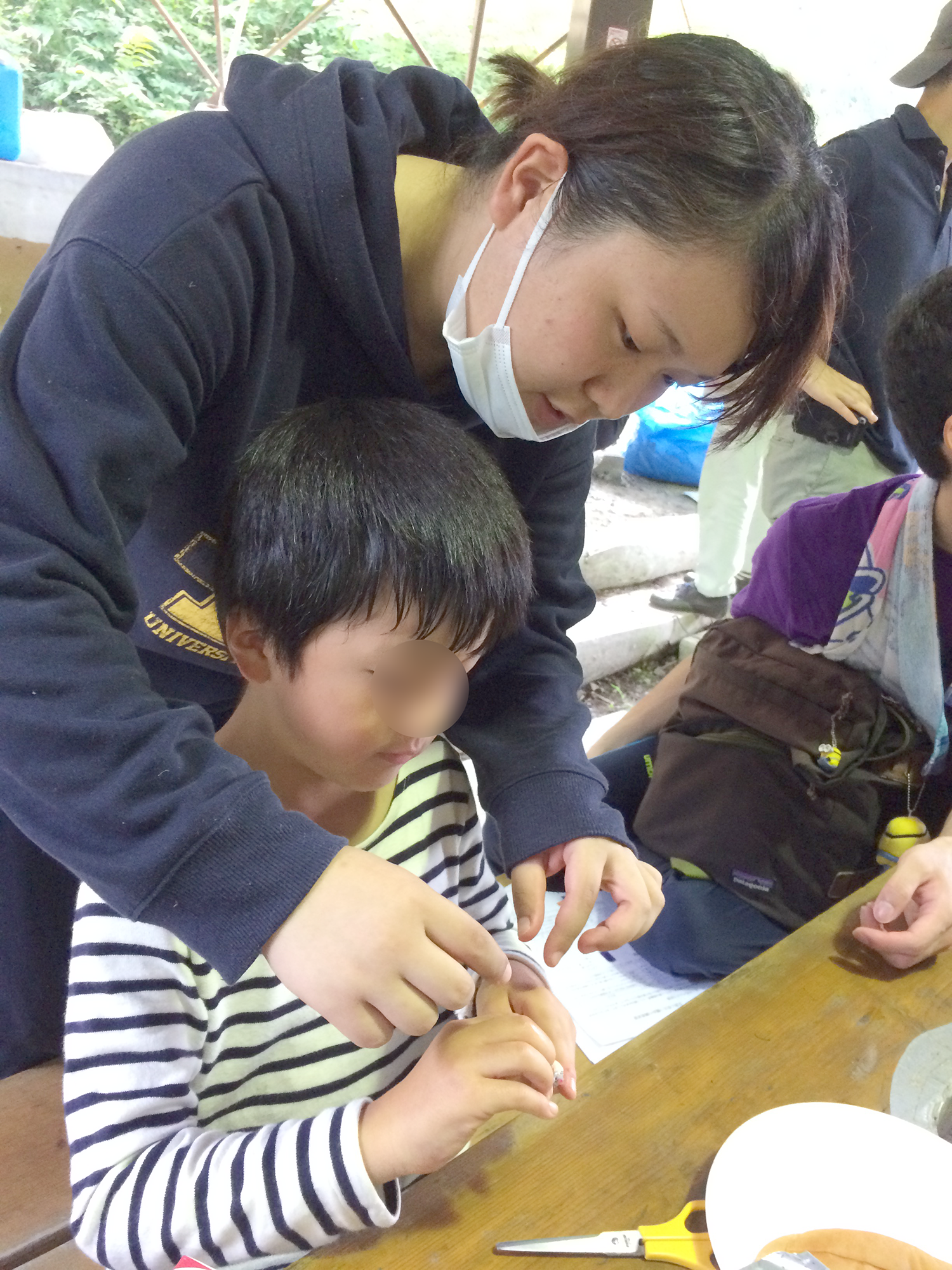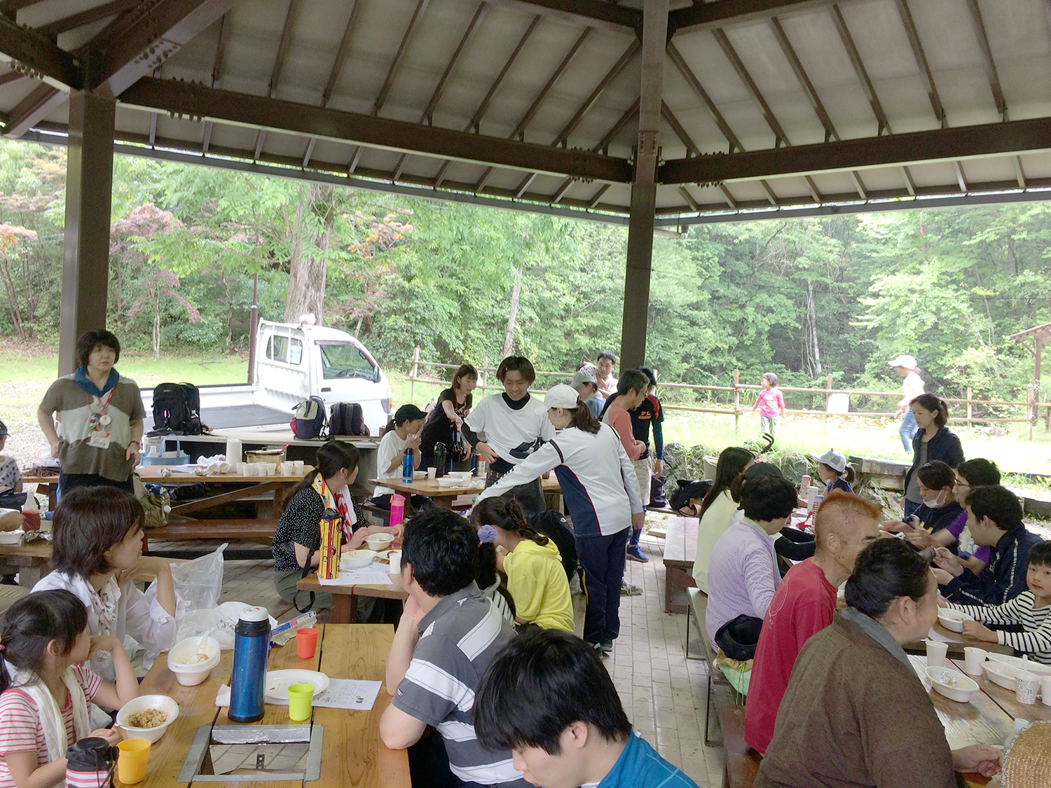 「食と地域の実践演習」の一環で、参加者は栄養学部フードデザイン学科学生12名、教員3名のほか、(株)宝塚すみれ発電、NPO法人新エネルギーをすすめる宝塚の会、コープこうべ組合の方々で、総勢約50名に上りました。農園作業が終わると、近くの自然の家バーベキューテラスに移動し、松田専任講師が「防災食の実践」を指導しました。アルミ缶や牛乳パックを利用しての炊飯、加温など防災食のノウハウを学びました。