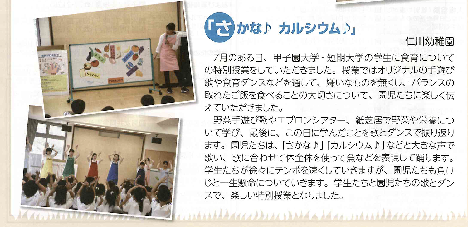 お知らせ2019.09.3 「出前食育授業」が、宝塚市の広報誌に紹介されました 栄養学部栄養学科の学生10人と甲子園短期大学の学生3人が7月17日、宝塚市立仁川幼稚園で行った「出前食育授業」の模様が、宝塚市の「広報たからづか 令和元年9月号」に掲載されました。仁川幼稚園の園児66人と、甲子園大学・甲子園短期大学が「食」を通して、オリジナルの手遊び歌や食育ダンスなでで交流した様子が紹介されました。 発信部署:事務局 « 前の記事へ 次の記事へ »