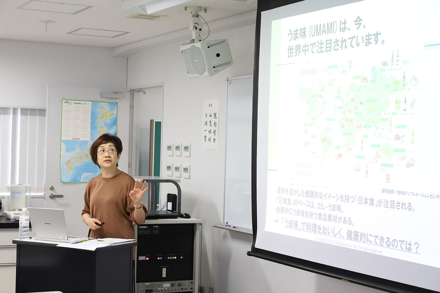 第2回講演会は9月25日、誰もが知っている「味の素®」を世界中の人たちに届けている味の素株式会社・営業企画部の萱沼公恵先生をお招きして、「うま味の再発見」と「味の素グループの商品開発」について、授業2コマにわたって教えていただきました。
