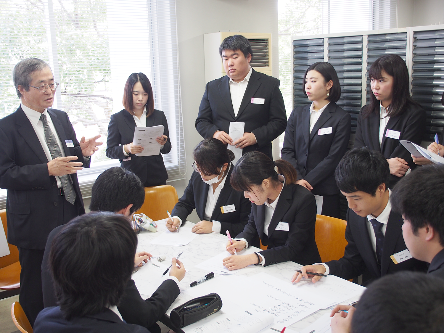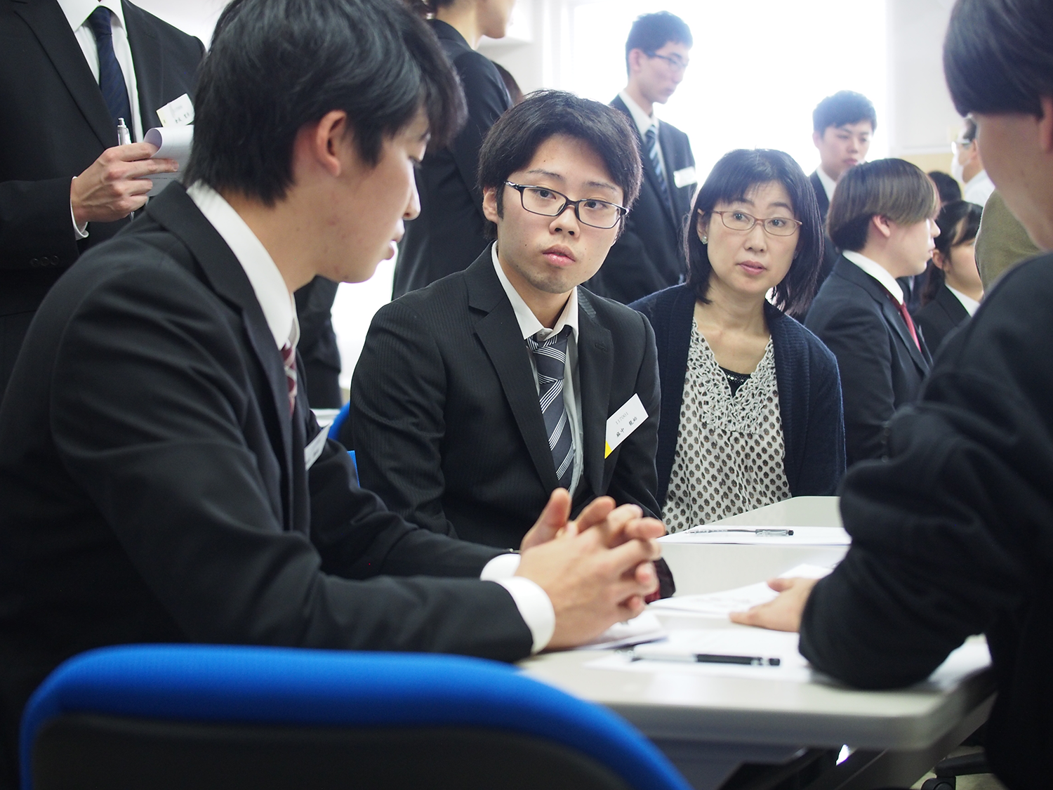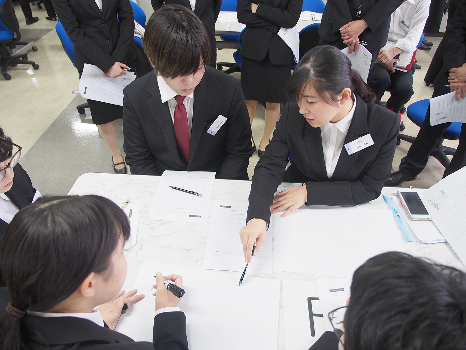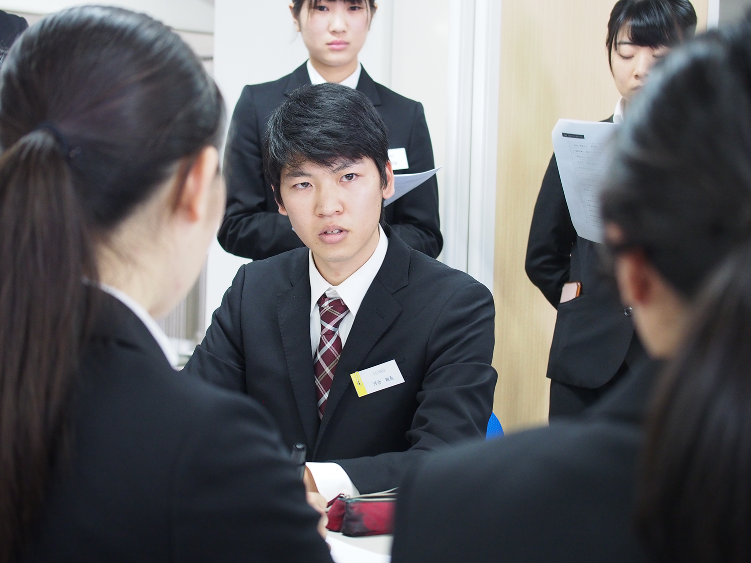 当日は少々緊張しながらも、熱心にディスカッションをする姿が見られました。授業では、ディスカッションの実践以外に、自分が面接官になったつもりで、他のグループのディスカッションも見学しました。参加した学生からは、「事前に思い描いていたようにはリーダーシップをとれなかった。想像以上にうまくできなくて悔しい」という感想や、「普段接点のない他の学生の意見を聞くことで、自分自身勉強になりました」といった意見が聞かれました。