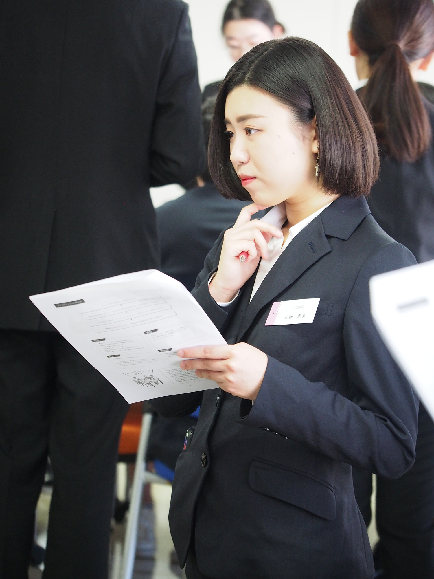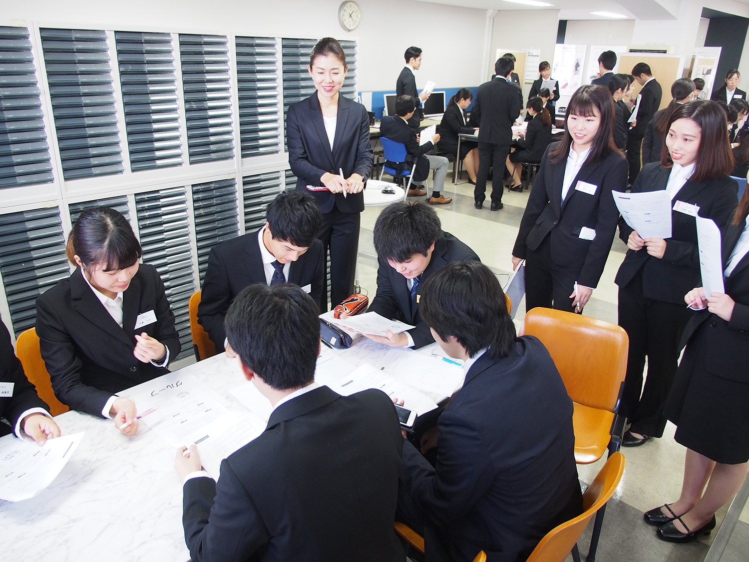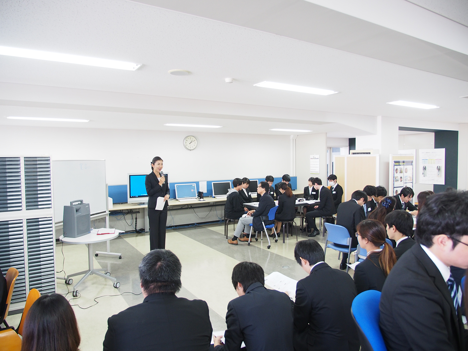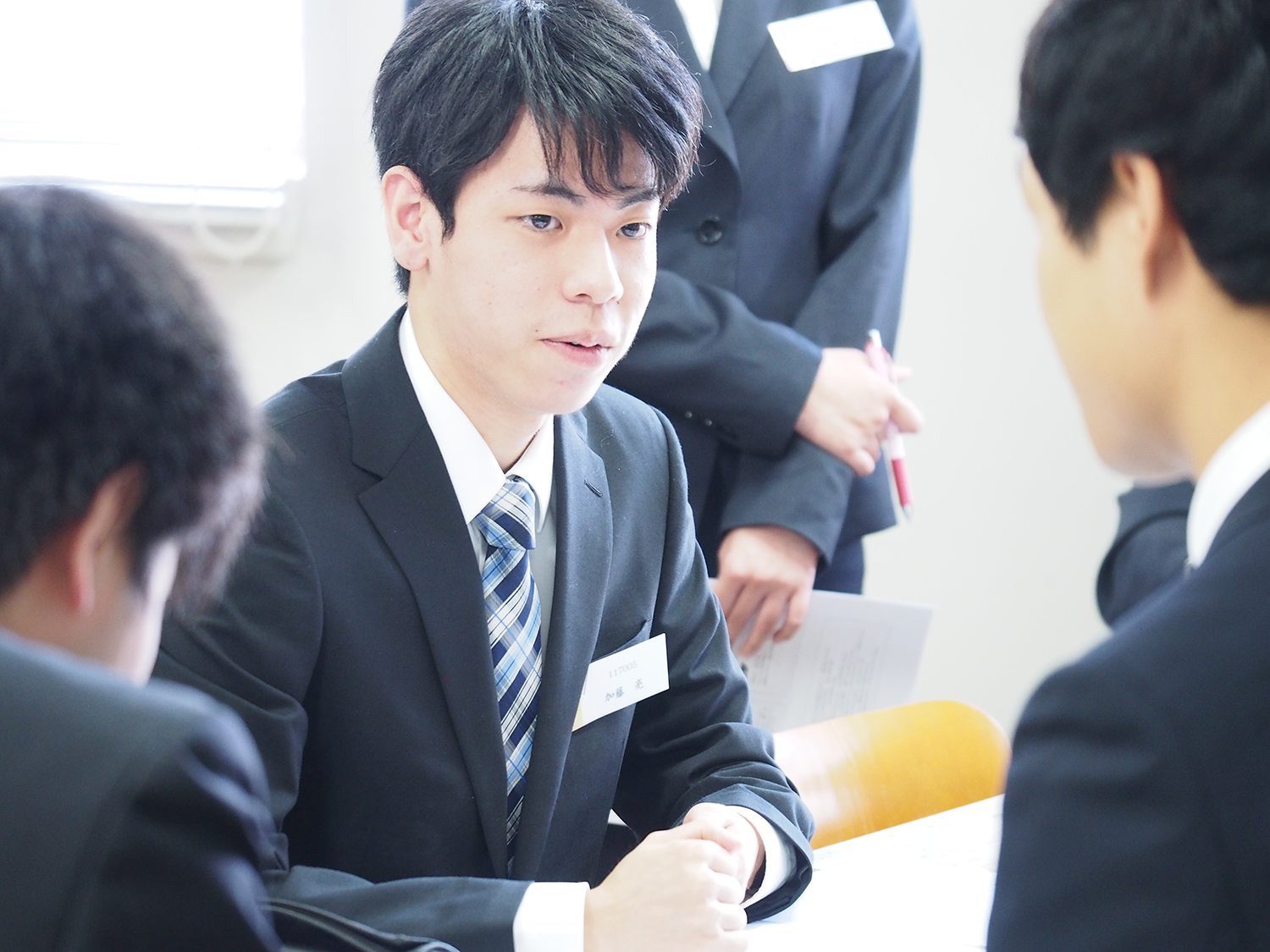 当日は少々緊張しながらも、熱心にディスカッションをする姿が見られました。授業では、ディスカッションの実践以外に、自分が面接官になったつもりで、他のグループのディスカッションも見学しました。参加した学生からは、「事前に思い描いていたようにはリーダーシップをとれなかった。想像以上にうまくできなくて悔しい」という感想や、「普段接点のない他の学生の意見を聞くことで、自分自身勉強になりました」といった意見が聞かれました。