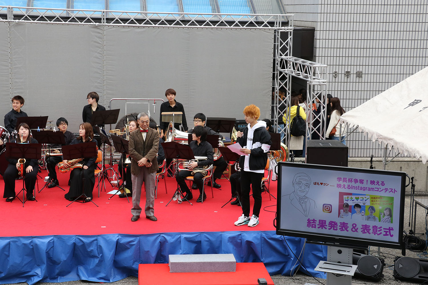 3日、紅葉祭のメインステージにて「ばえ♥コン!」(学長杯争奪! 映えるinstagramコンテスト)の結果発表ならびに表彰式を行いました。同コンテストは、甲子園大学をインスタグラムで広く発信するために企画され、229作品の写真投稿がありました。