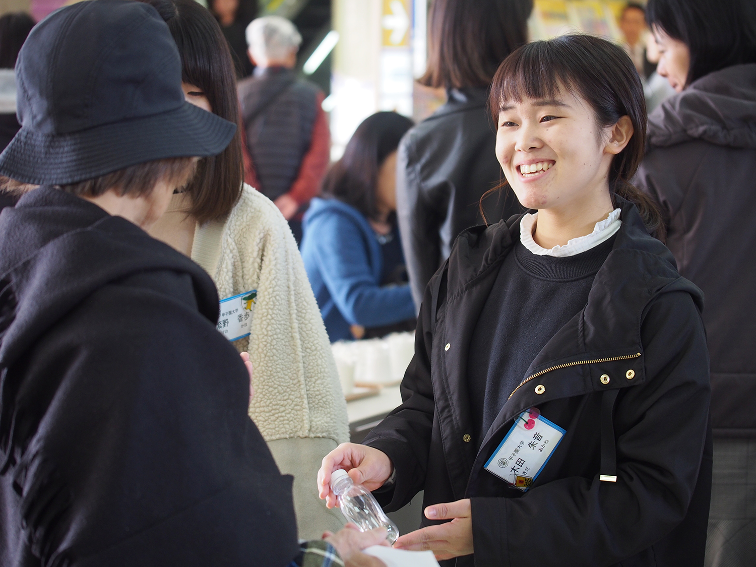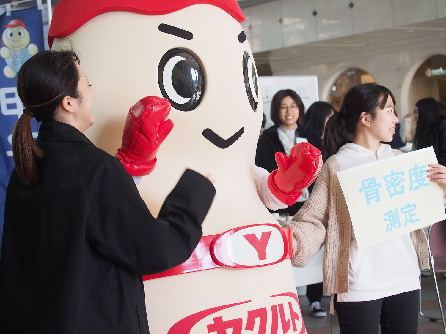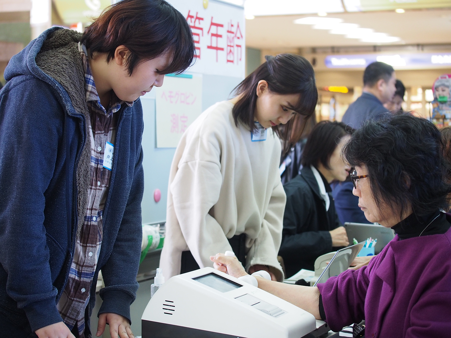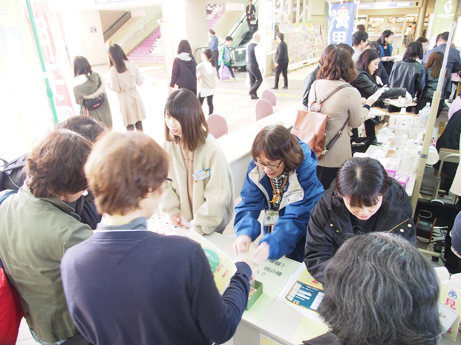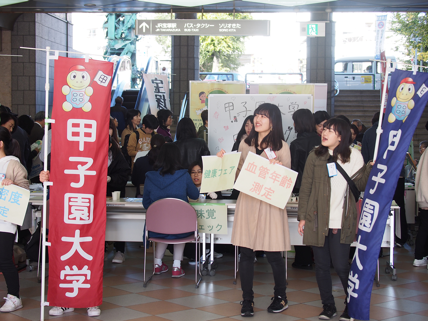 11月15日、栄養学部栄養学科3回生が食育実践演習の一環で、「健康フェア」に参加しました。このイベントは本学が主催で、近畿中央ヤクルト販売、宝塚市、阪急交通社などの企業が共催でソリオ宝塚にて行われました。味覚・嗅覚チェックやヘモグロビン測定などのコーナーを設け、学生が考案したレシピや、貧血や骨の健康に関するリーフレットを配布しました。寒い1日となりましたが、大変多くの方々に参加していただきました。学生たちは、参加者からの突然の質問にも笑顔で積極的に対応するなど「食」を通した地域貢献に励みました。