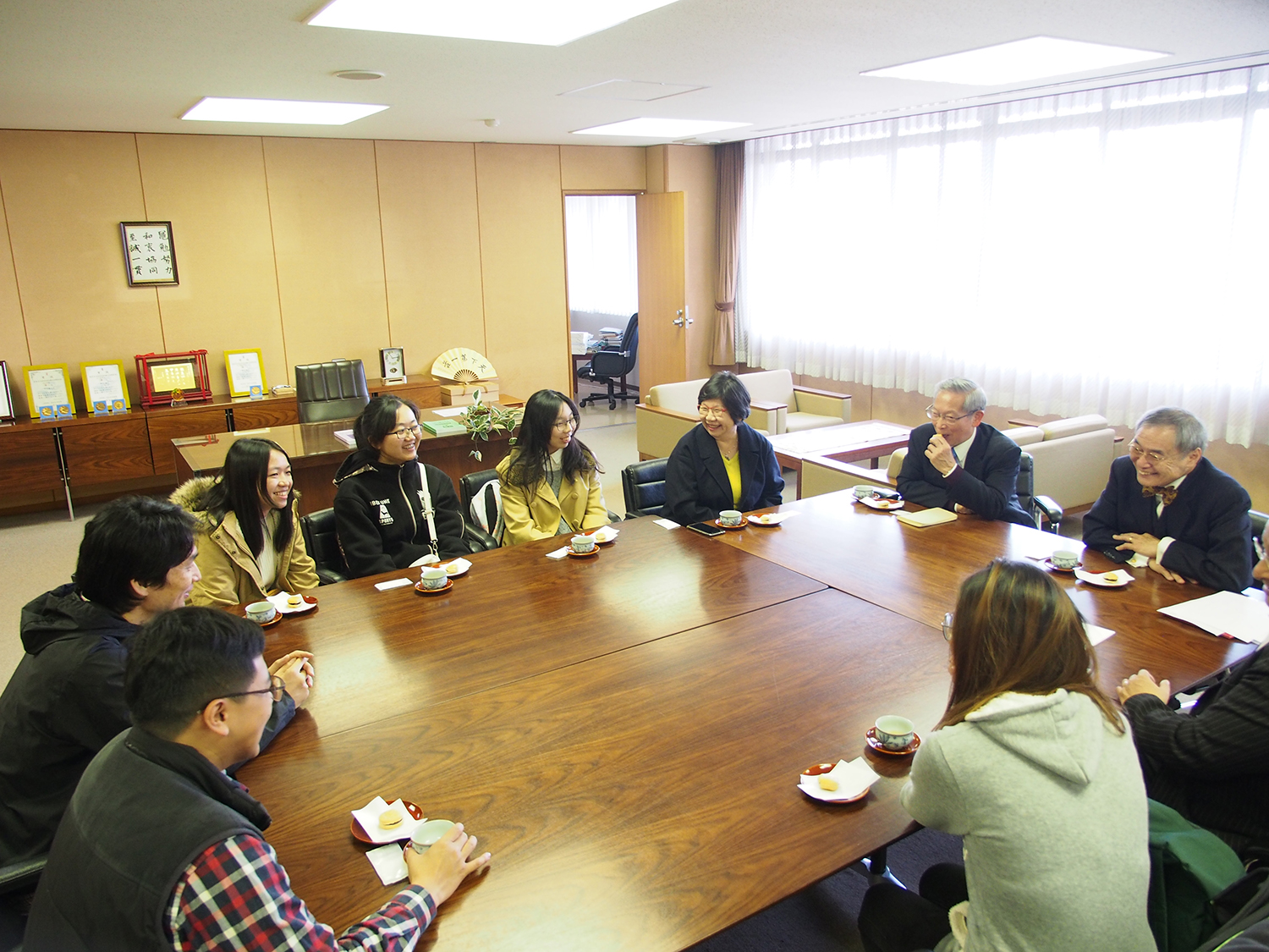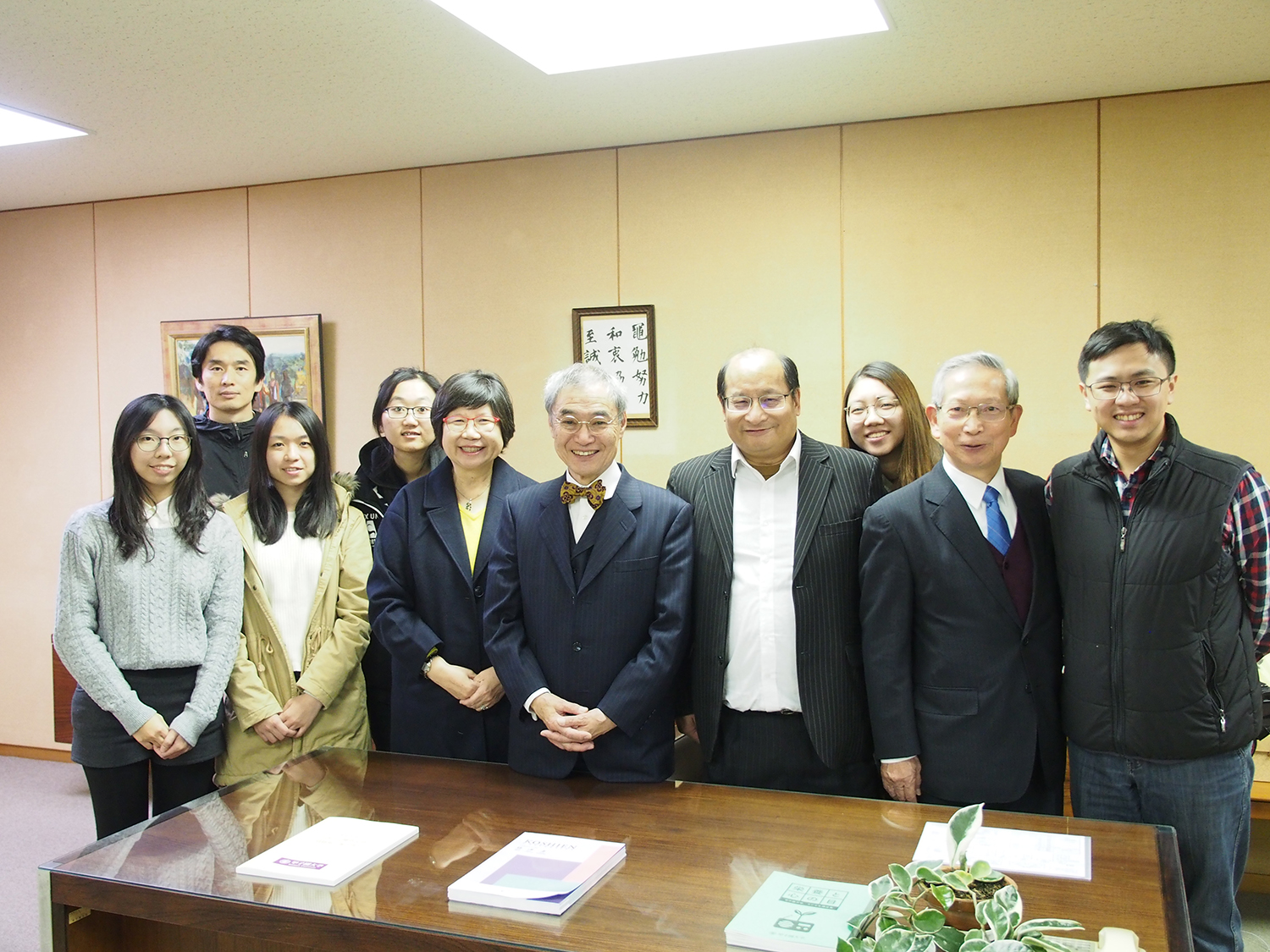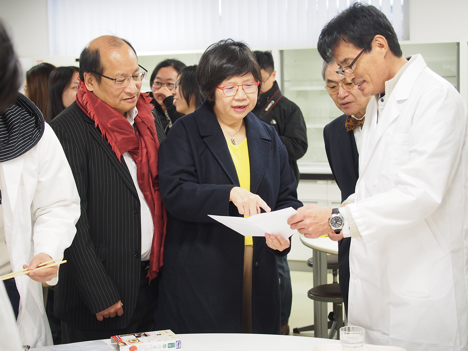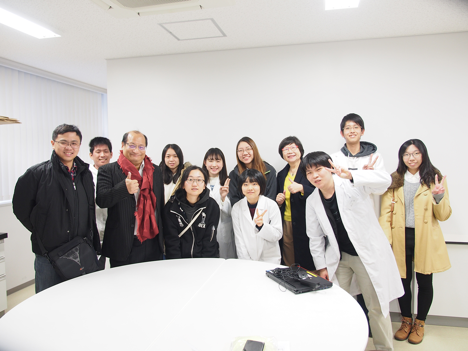 12月6日、中山醫學大學の張菡馨主任教授、林培正教授と学生さん計7名が本学を来訪されました。一行は1日から5日まで「国際栄養補助機能食品学会」の神戸国際大会に発表に来られ、合間に少しの時間を見て立ち寄ってくれたものです。同大學は、医学部や健康管理学部、口腔学部などを擁する台湾台中市にある名門私立大学。本学とは1989年の姉妹校提携調印以来、活発な交流があり、今年3月には本学の教員、学生34人が台湾研修旅行を行っています。