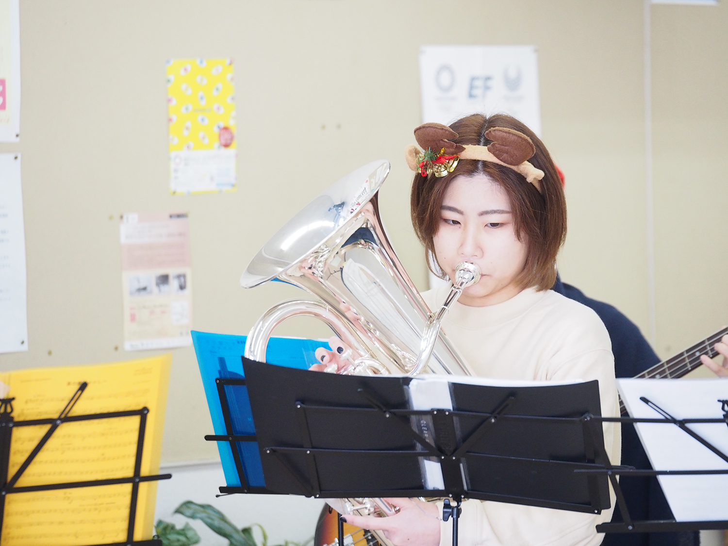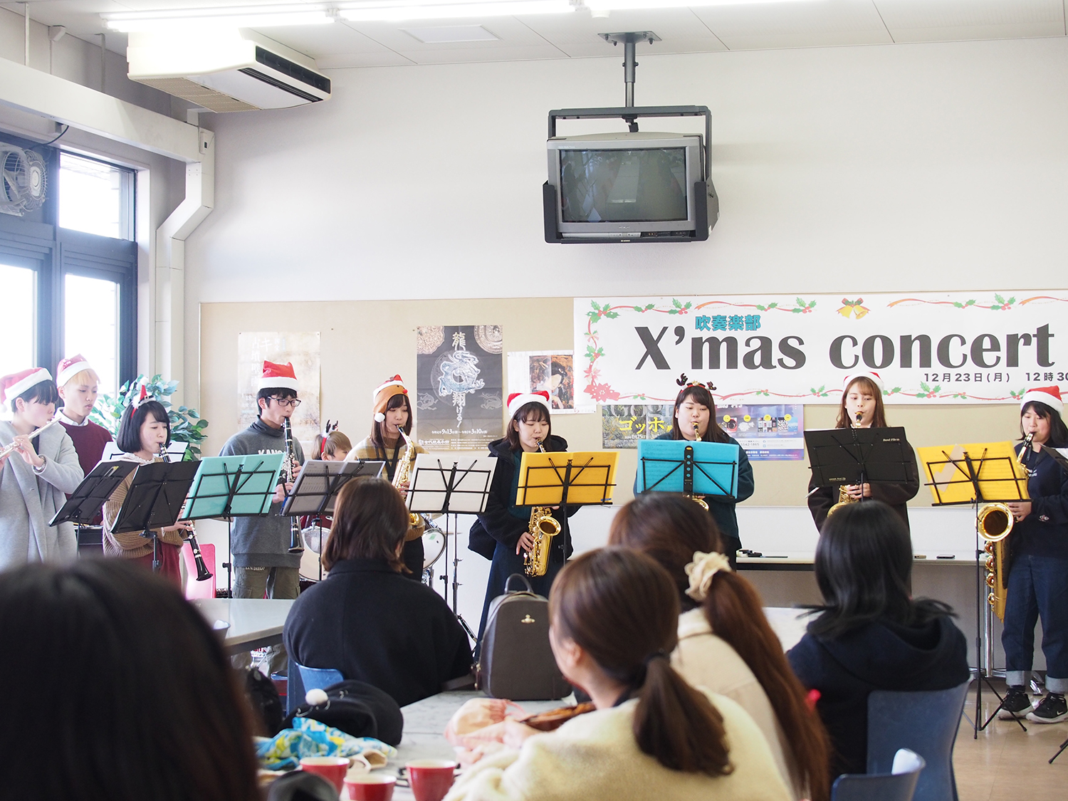12月23日の昼休み、本学のメイプルキッチン(食堂)にて、吹奏楽部が「クリスマスコンサート」を行いました。今年で第4回目となるこのコンサートでは、「彼方の光/LIBERA」「恋人たちのクリスマス/ライア・キャリー」「クリスマスソング/back number」を演奏しました。ホールに集まった学生、教職員はランチを食べながら、演奏に耳を傾け、一足早いクリスマス気分を味わいました。