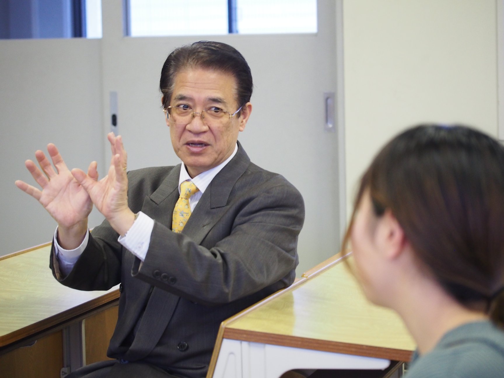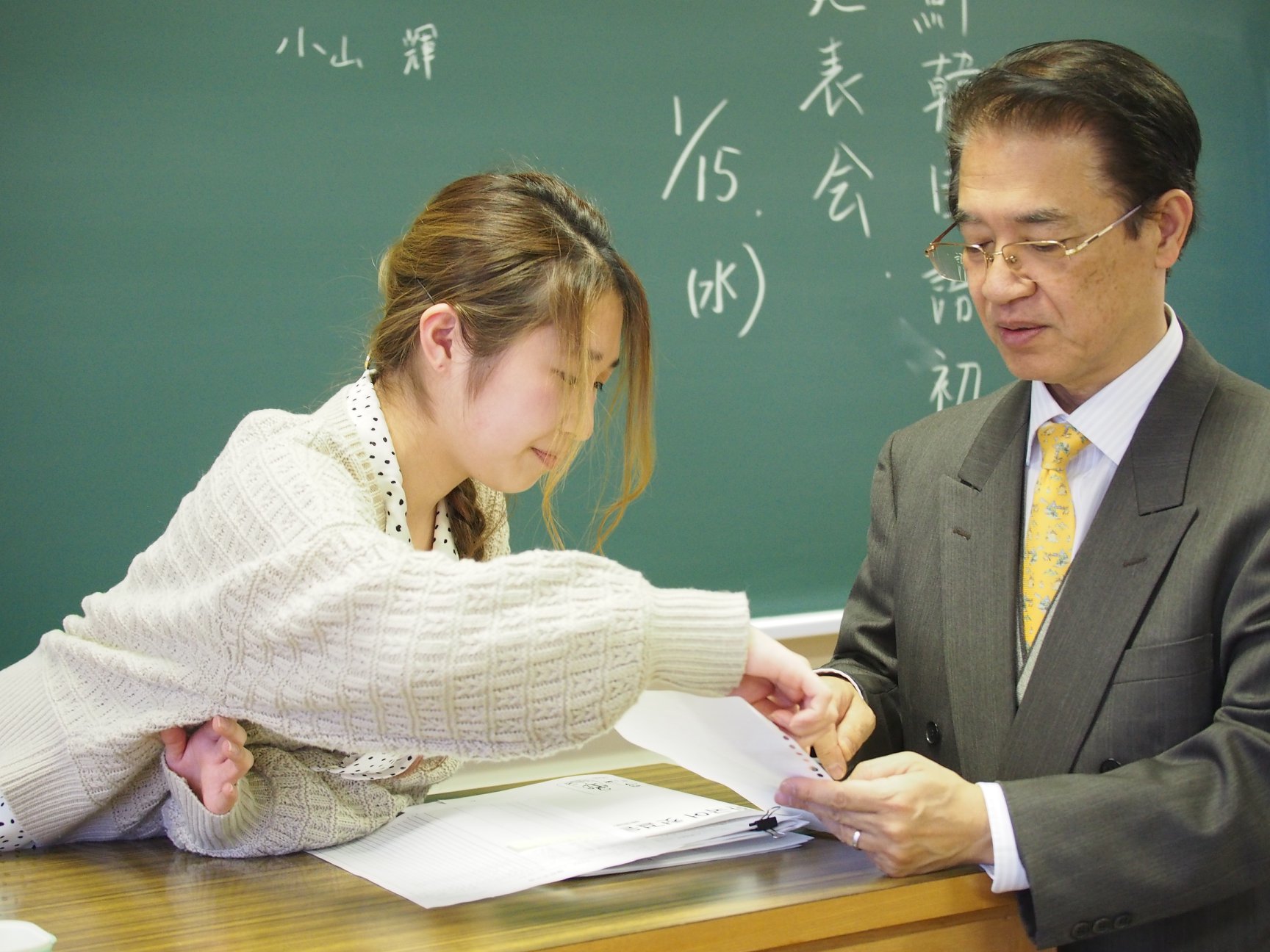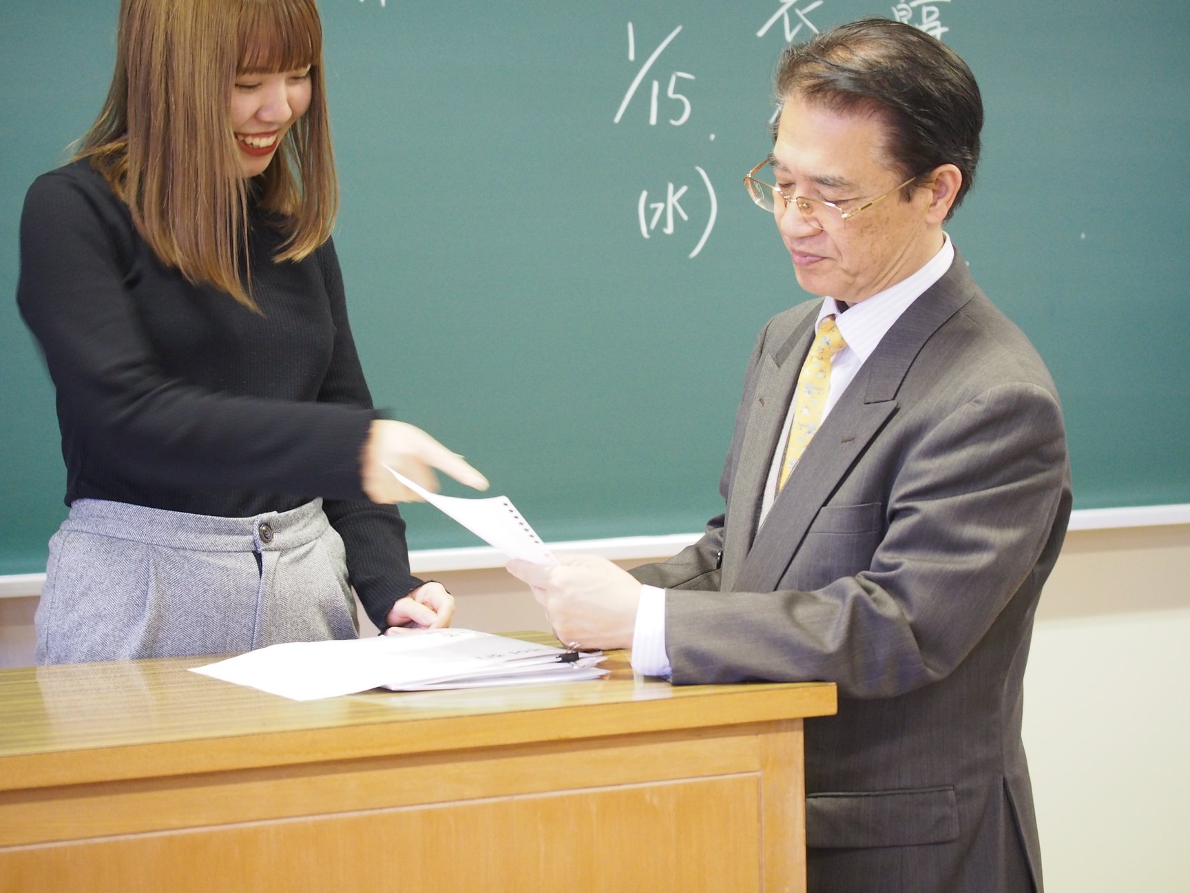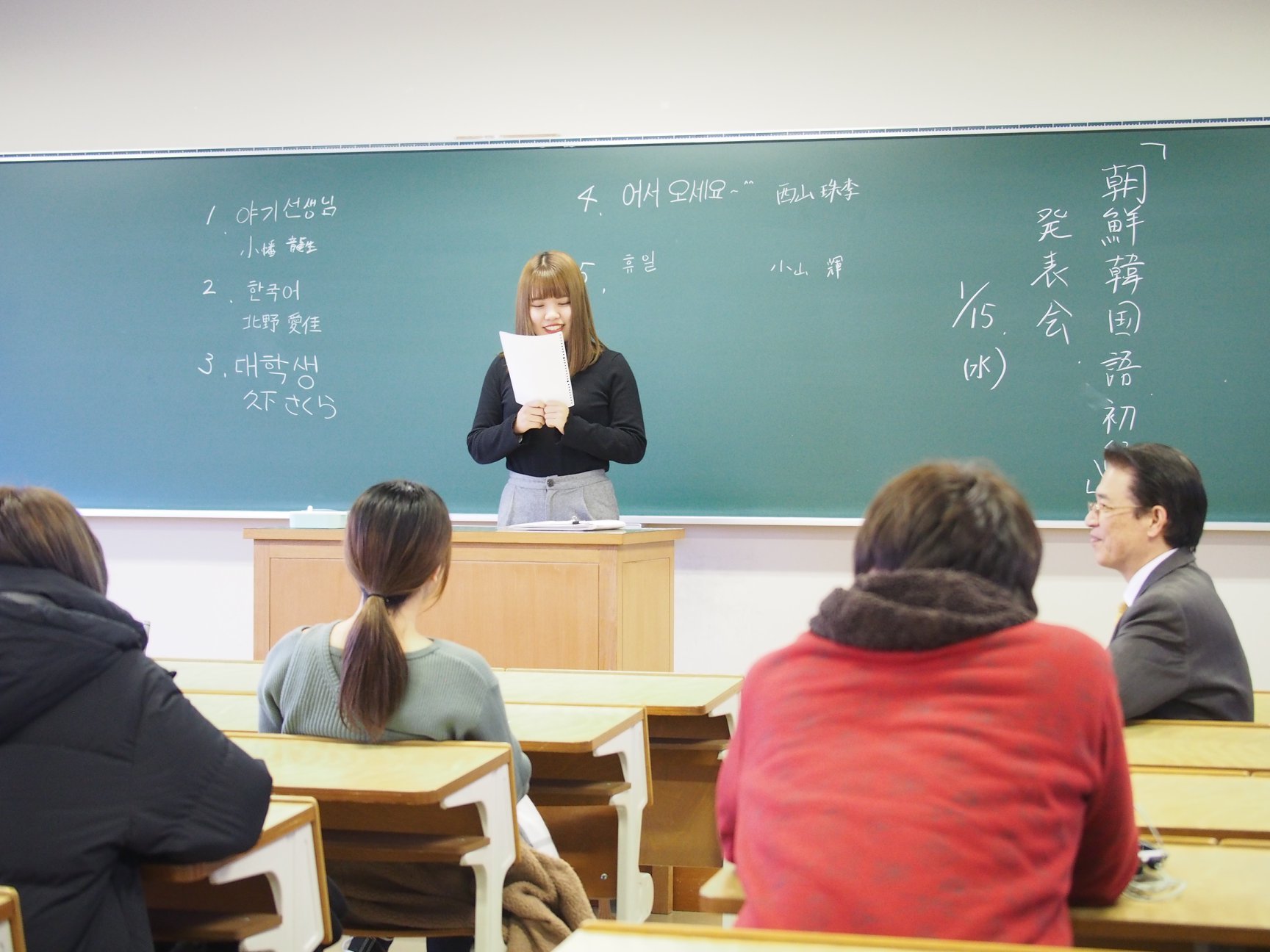 テキストを用いて、ハングルの基本から学習し、挨拶、自己紹介、簡単な文章読解・作文の練習をしています。前期・後期と通年取り組めば、ちょっとした会話が出来るようになります。今回の授業は、学生それぞれが自分でテーマを決めて韓国語で作成した文章を皆の前で発表するものです。授業では韓国の歴史や文化等も解説しています。この度、学生たちの希望により、3月に韓国研修旅行を計画しています。熊谷教授のかつての同僚が先日、釜山総領事に就任したことで、訪韓の際には在釜山日本国総領事館を表敬訪問し、総領事から日韓関係のレクチャーを受ける予定です。総領事は小泉・金正日会談の通訳を務めた人です。