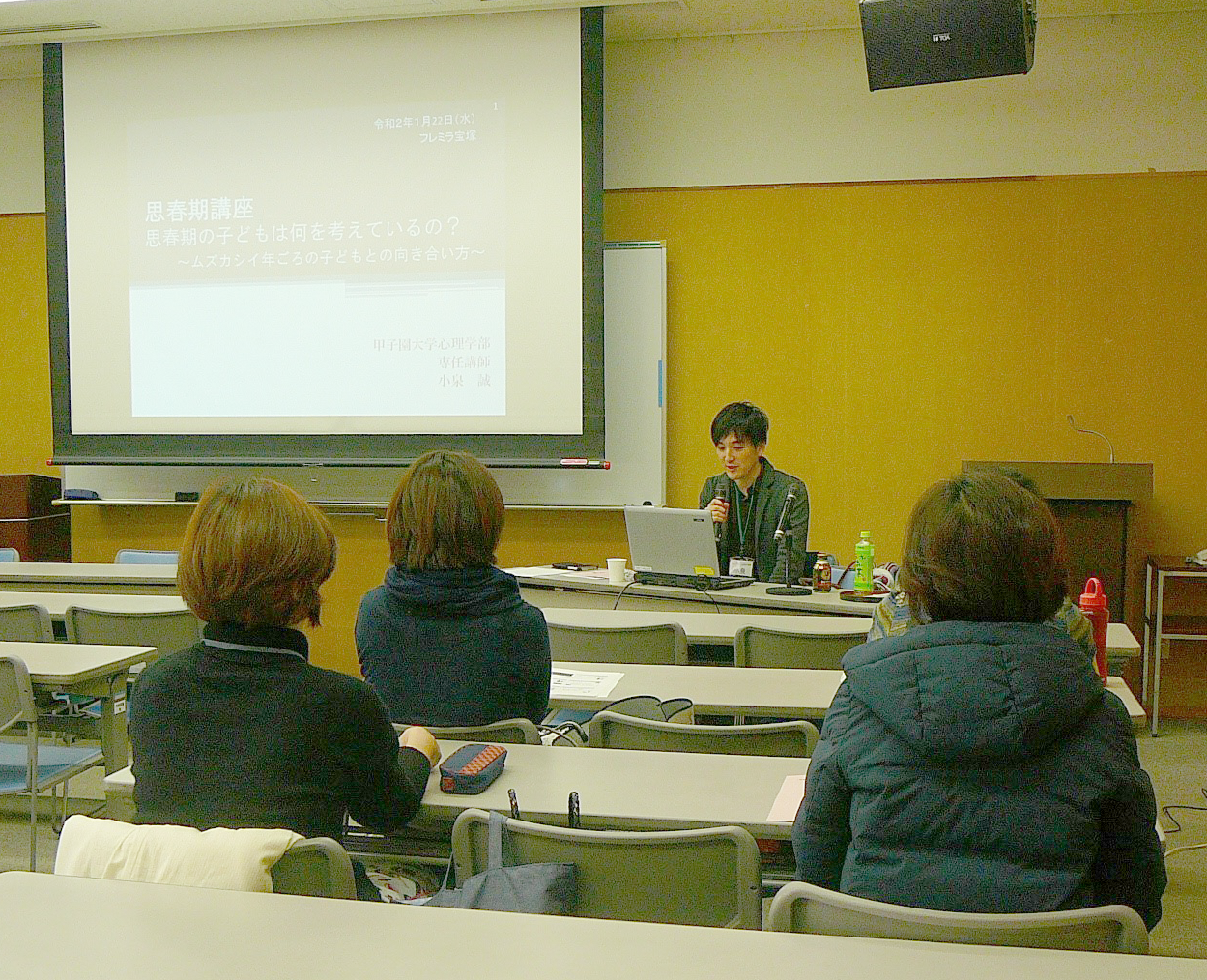10~15歳児の保護者を対象とした「思春期講座」(宝塚市子ども家庭支援センター共催)を、フレミラ宝塚で開催しました。現在、この講座は本学心理学部の教員2名が担当しています。今年度の夏期(7月)は東斉彰教授、冬季(1月)は小泉誠専任講師が担当しました。