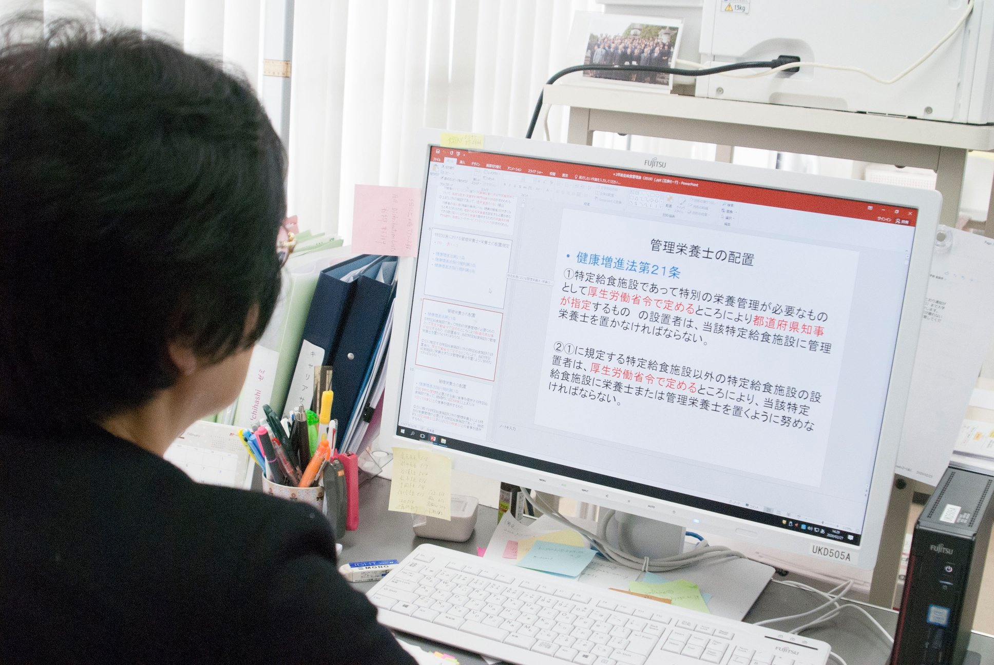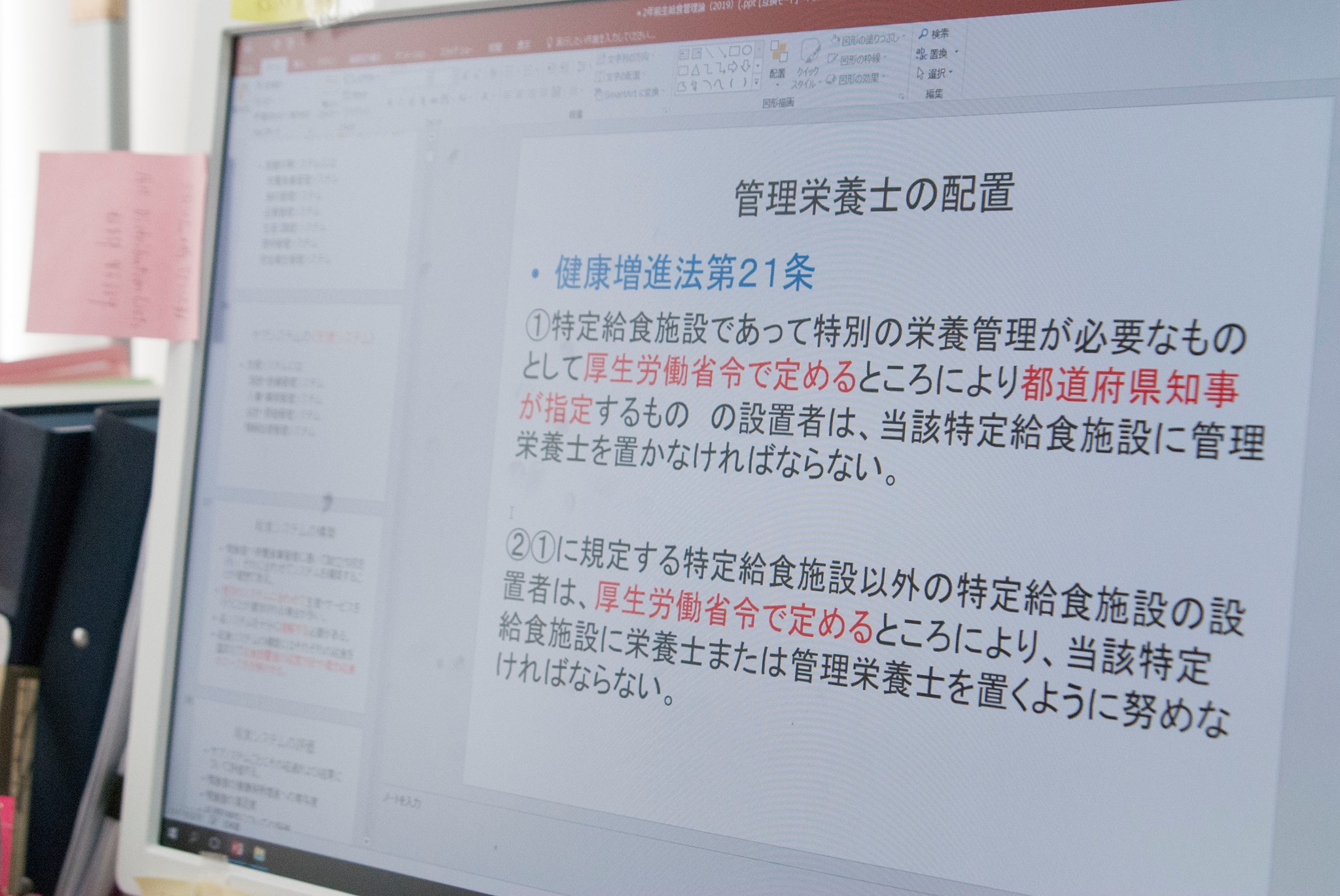 本学には昨春に着任し、「給食経営管理論」などの授業を担当しています。「給食経営管理論」は、管理栄養士の基礎となる重要な科目で、広い視野から栄養を考えます。学生の皆さんには、食を通して知識を深めることはもちろんですが、人と人との関りに食が大切であることを学び、社会に貢献できる心豊かな管理栄養士になってもらいたいと考えています。