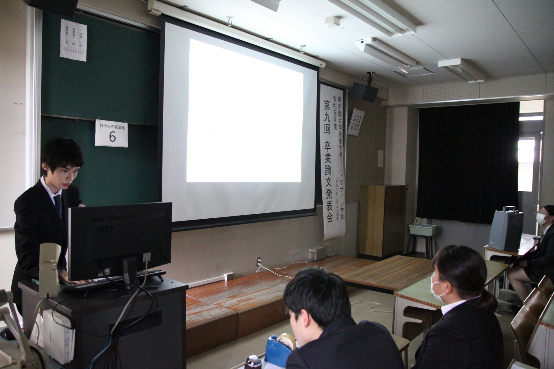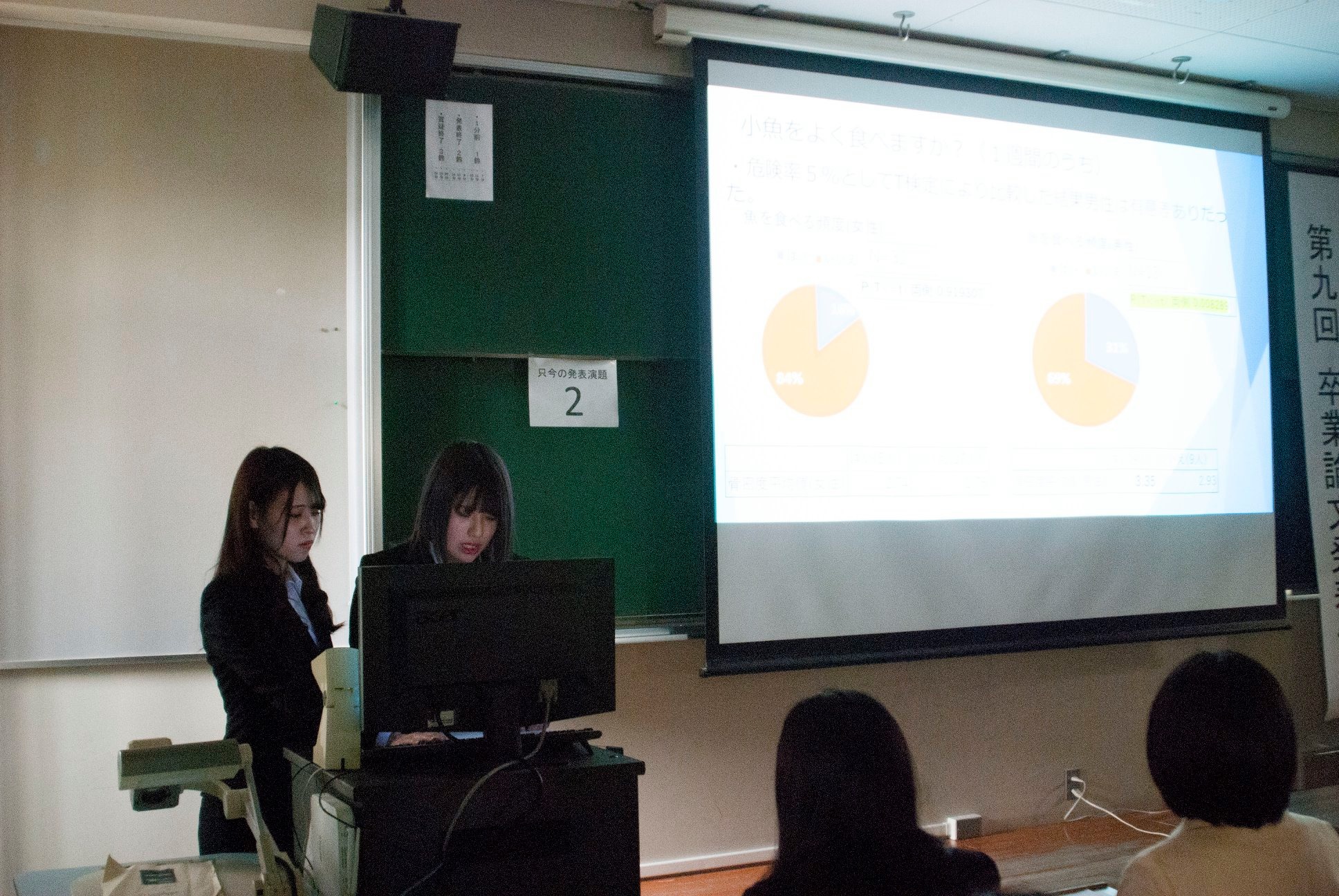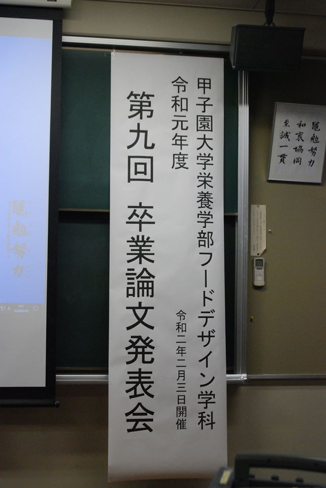 2月3日、令和元年度の栄養学部フードデザイン学科第9回卒業論文発表会が開催されました。各研究室で先生方の指導を受け、取り組んだ研究の成果10題が発表されました。今年度は微量元素の亜鉛、骨密度、そばアレルギー、手作りマヨネーズ、糖質の新規結晶化法、イソマルトデキストリン、CoQ10とビフィズス菌、乳酸菌、組換えタンパク質といった、栄養から食品分野まで、幅広いテーマの発表がありました。少し緊張気味だったり、はじめから落ち着いた様子だったりと、4回生の様子は様々でしたが、発表後は活発な質疑応答が行なわれました。このような経験は、社会に出てからも役立つでしょう。