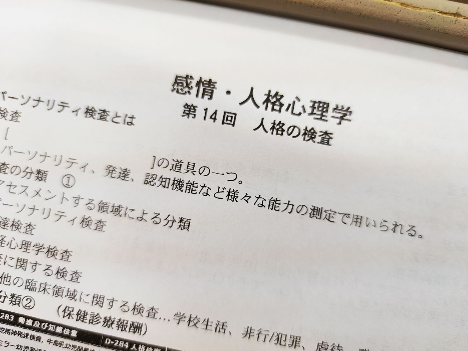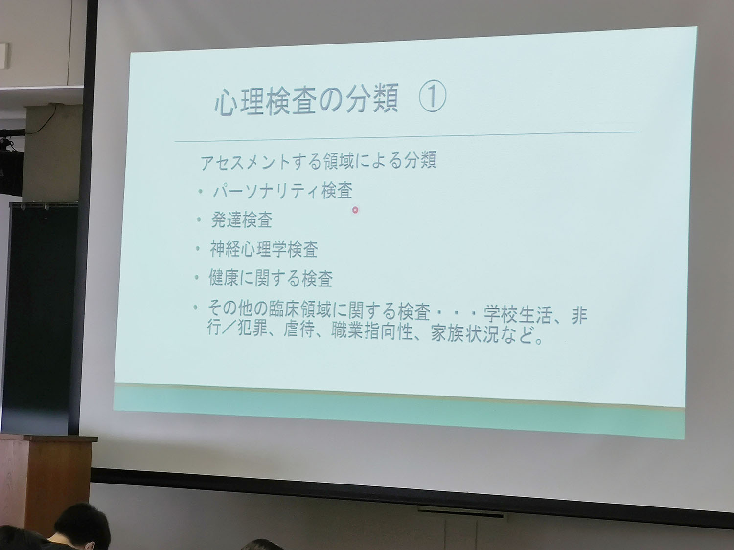 第14回は小泉専任講師が「人格の検査」について講義しました。臨床実践の現場では様々な心理検査が用いられます。その中でも、クライエントの性格特徴を把握し、病理や問題を査定してカウンセリングの方針を立てるための情報収集に使用されるのが人格検査です。講義では、人格検査を「質問紙法」と「投映法」に大別し、それぞれの検査法の性質や長所短所が解説されました。投映法とは、ロールシャッハテストやTATなどのように絵や図に対して被検者が感じるイメージを言葉にしてもらう検査です。そのイメージの中に被検者の人格が投映されると考えています。この投映法検査についてはワークを通して、現場での使われ方を体験的に学びました。