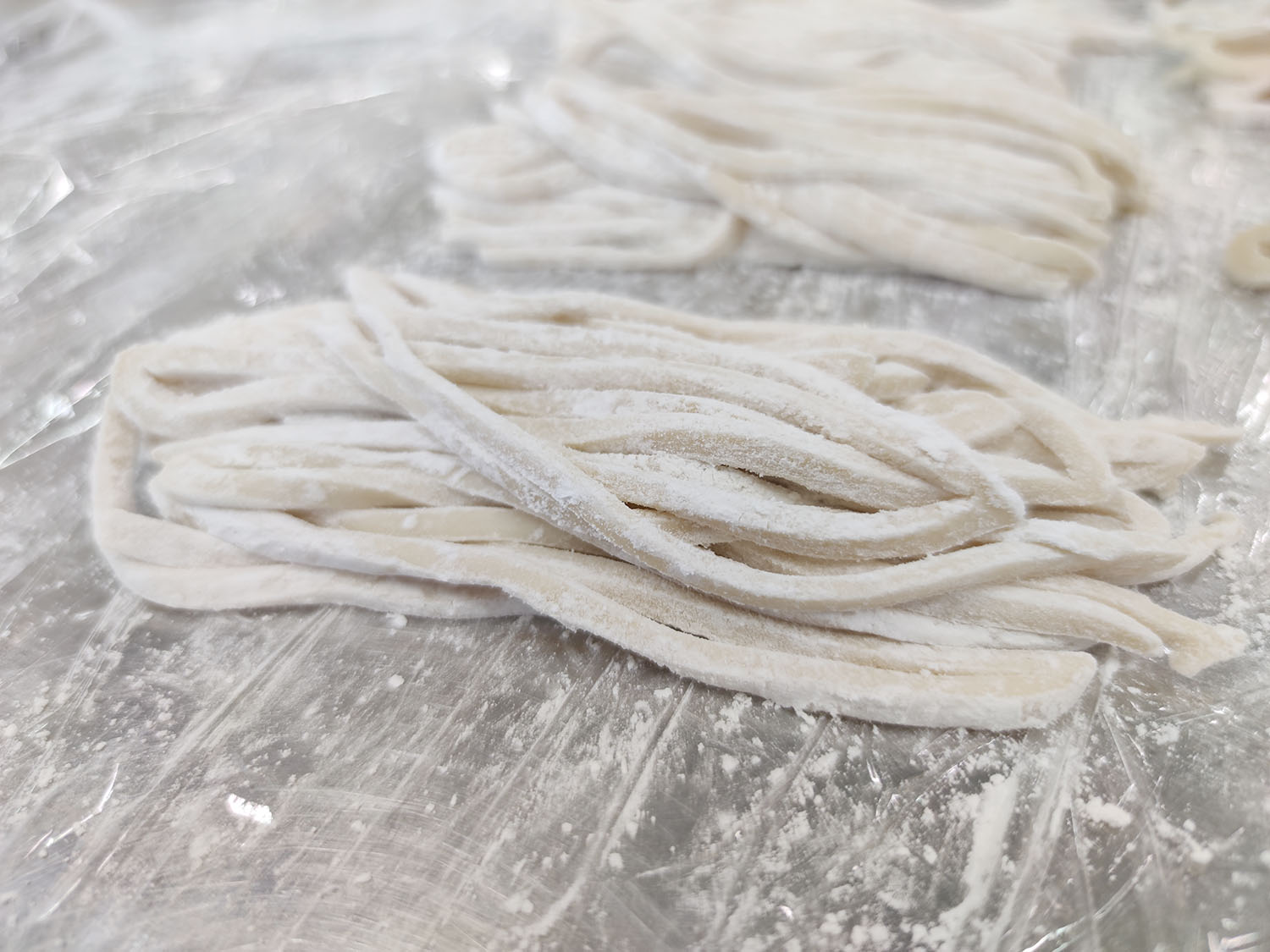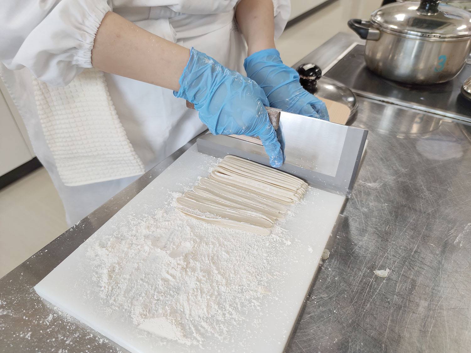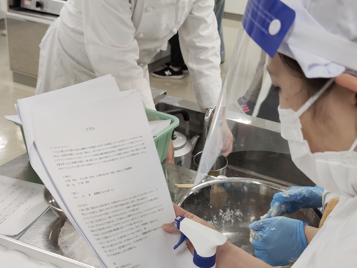 食品加工学実習では、加工食品の製造を体験する事で、食品加工の方法や製造工程の原理を学びます。この授業を通じて学生たちは、加工食品やその取り扱い方に関する幅広い知識を習得します。扱う食材は豆類、いも類、穀類、種実類、乳類、肉類、魚介類、野菜類、果実類など多岐にわたります。7月7日(火)は、小麦粉の中力粉を使用したうどん、こんにゃくいもを使用したこんにゃく、牛乳を使用したヨーグルトを作りました。普段よく食べている食品がどのようにして作られているかについて、体験的に楽しく学ぶ事ができました。