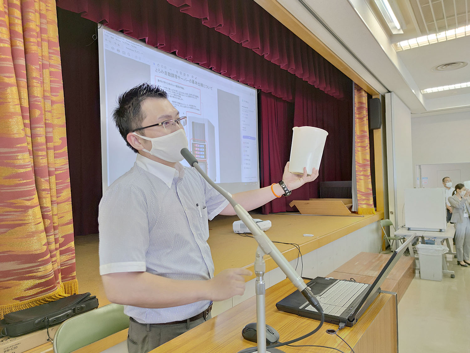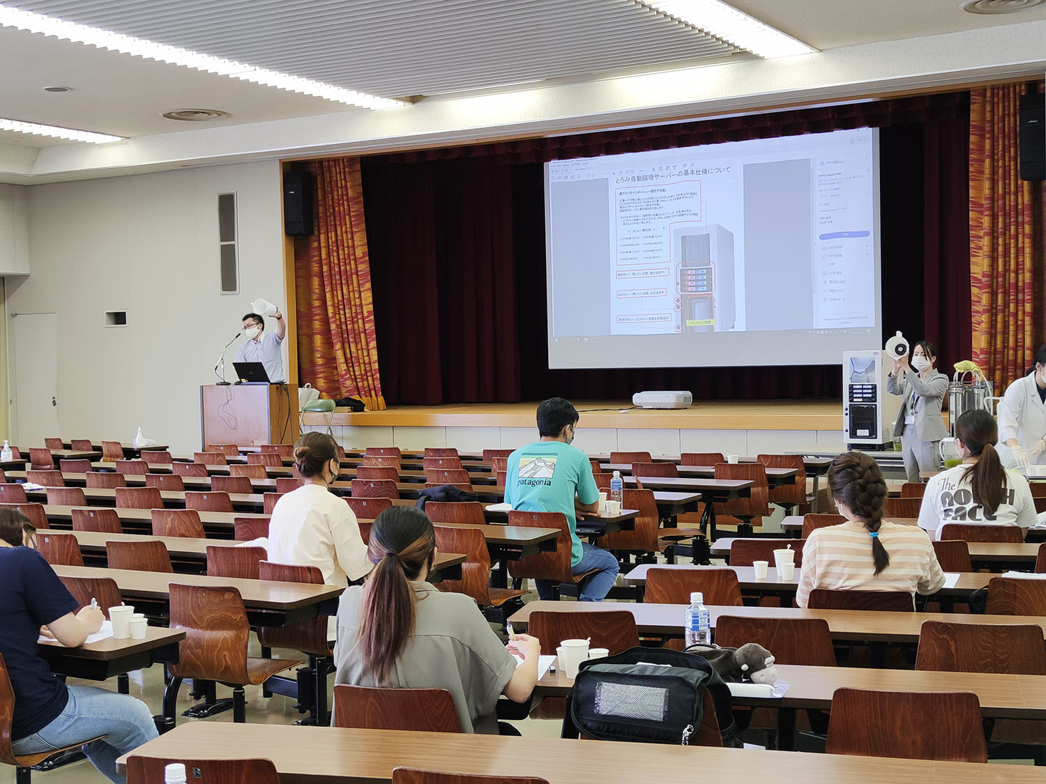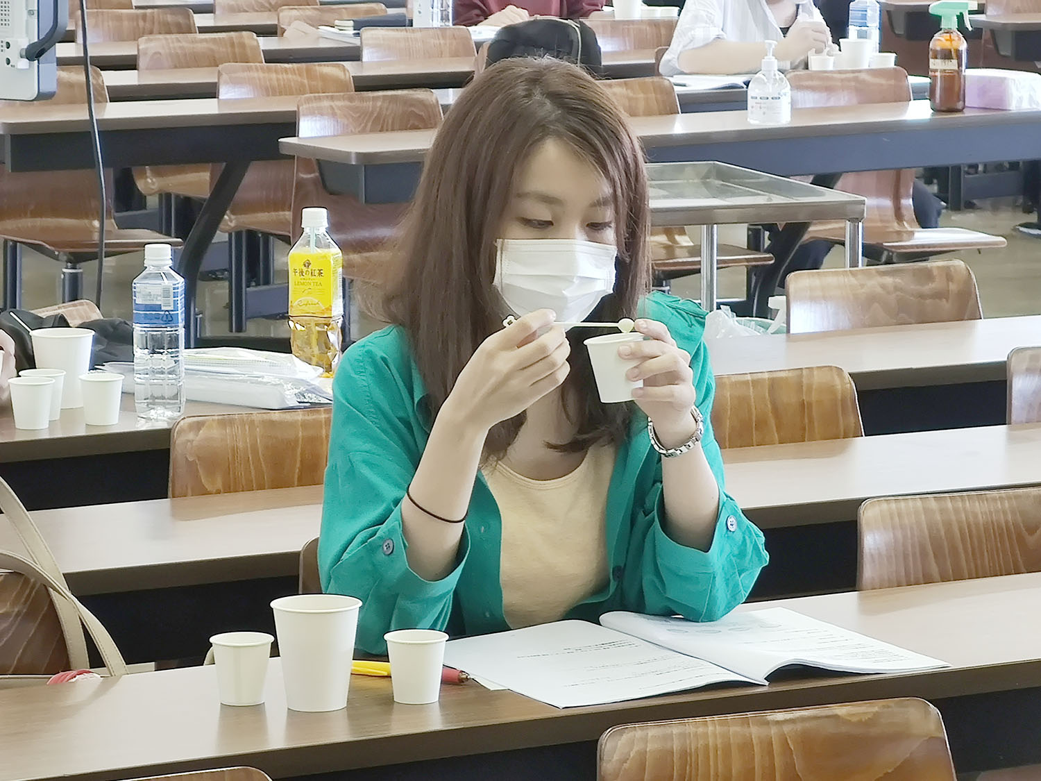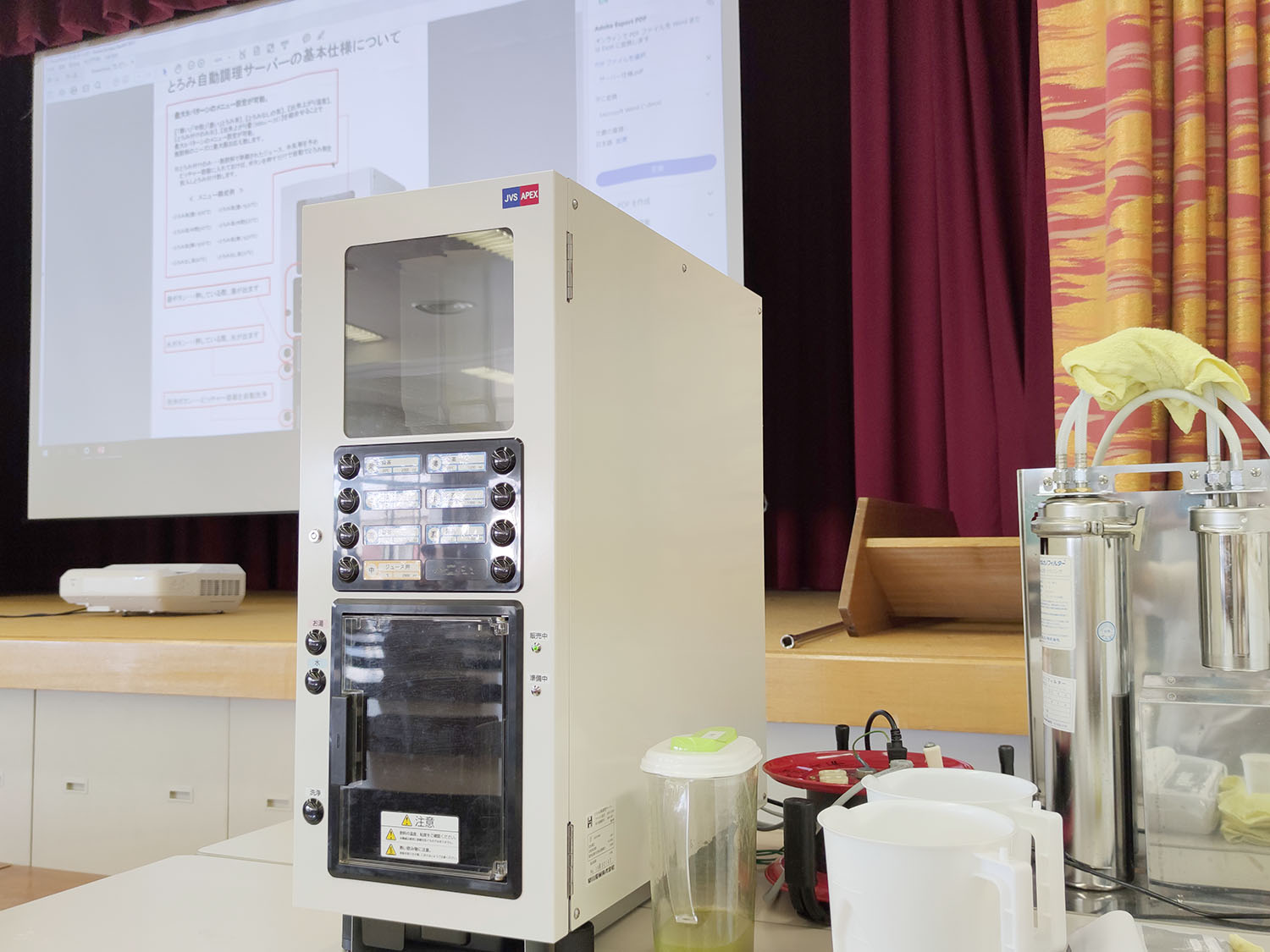実習後半には、学生自身の手でとろみ材を緑茶に加える体験が行われ、続いて特別講師の株式会社アペックス様による「とろみ自動調理サーバー」のデモンストレーションが行われました。自動調理サーバーにより「薄いとろみ」、「中間のとろみ」、「濃いとろみ」の3段階のとろみが付けられた緑茶が次々とできあがり、学生は自分たちの手でとろみを付けたお茶と飲み比べを行いました。「自分でとろみ材を混ぜると時間がかかったり、ダマが出来たりするけど、自動調理機は早く調理することができ、しかも均一になっていた」、「高齢化が進む日本で、広く普及してほしい」などの感想があり、学生は実体験を通じて深い学びを得ることができました。