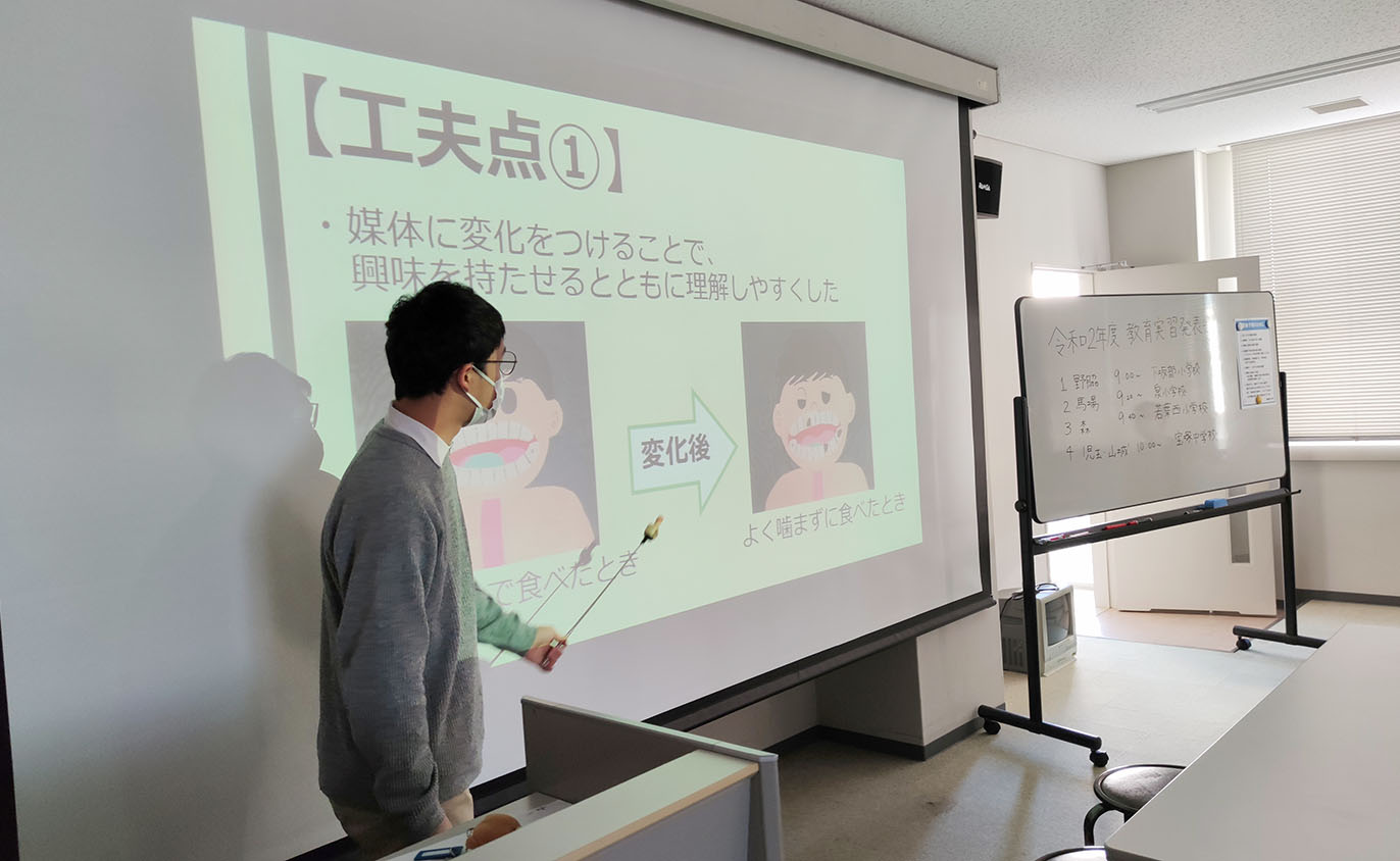 4回生のみなさんは、教育実習を通して栄養教諭やその他の教職員、児童生徒たちから学んだ多くのこと、教育実習に臨むまでの準備が実際に学校現場でどのように役に立ったか等、教育実習を振り返りながらそれぞれの想いをプレゼンしました。