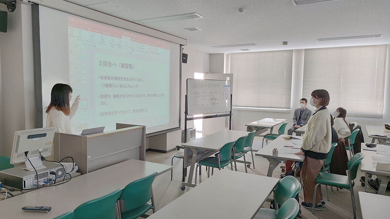 教職課程の集大成として、4回生では実際に小学校や中学校に行って授業などを行う「教育実習」を行います。この教育実習の報告会が「教職実践演習」の授業内で行われました。