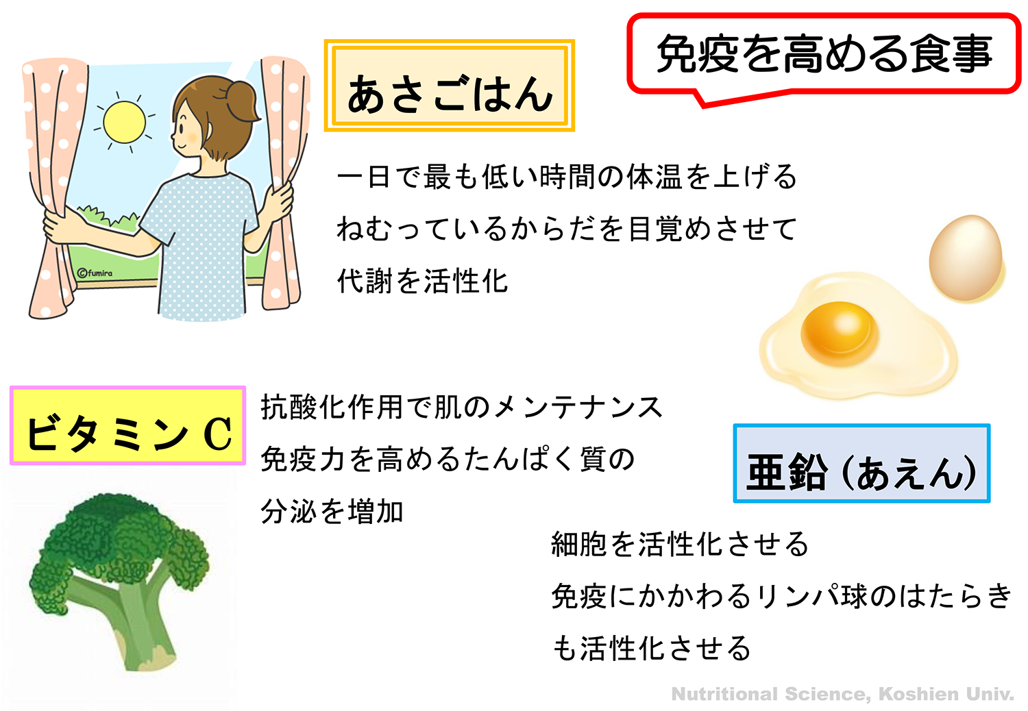これまで行った調査では、朝食をとると体温が上昇して代謝が活性化し、移動することが多い朝の時間帯の免疫力を高める可能性が示されました。また、健康の維持に重要なはたらきをもつビタミンCと亜鉛を組み合わせて摂取すると、インフルエンザやかぜの予防と回復促進に有効であることが、学術論文で報告されています。そこで私達は、ともに免疫力を高めるはたらきをもつ「ビタミンC」と「亜鉛」を豊富に含む食材を用いた「朝食」をとることによって、免疫力を高める相加的なはたらきが期待できると考えました。