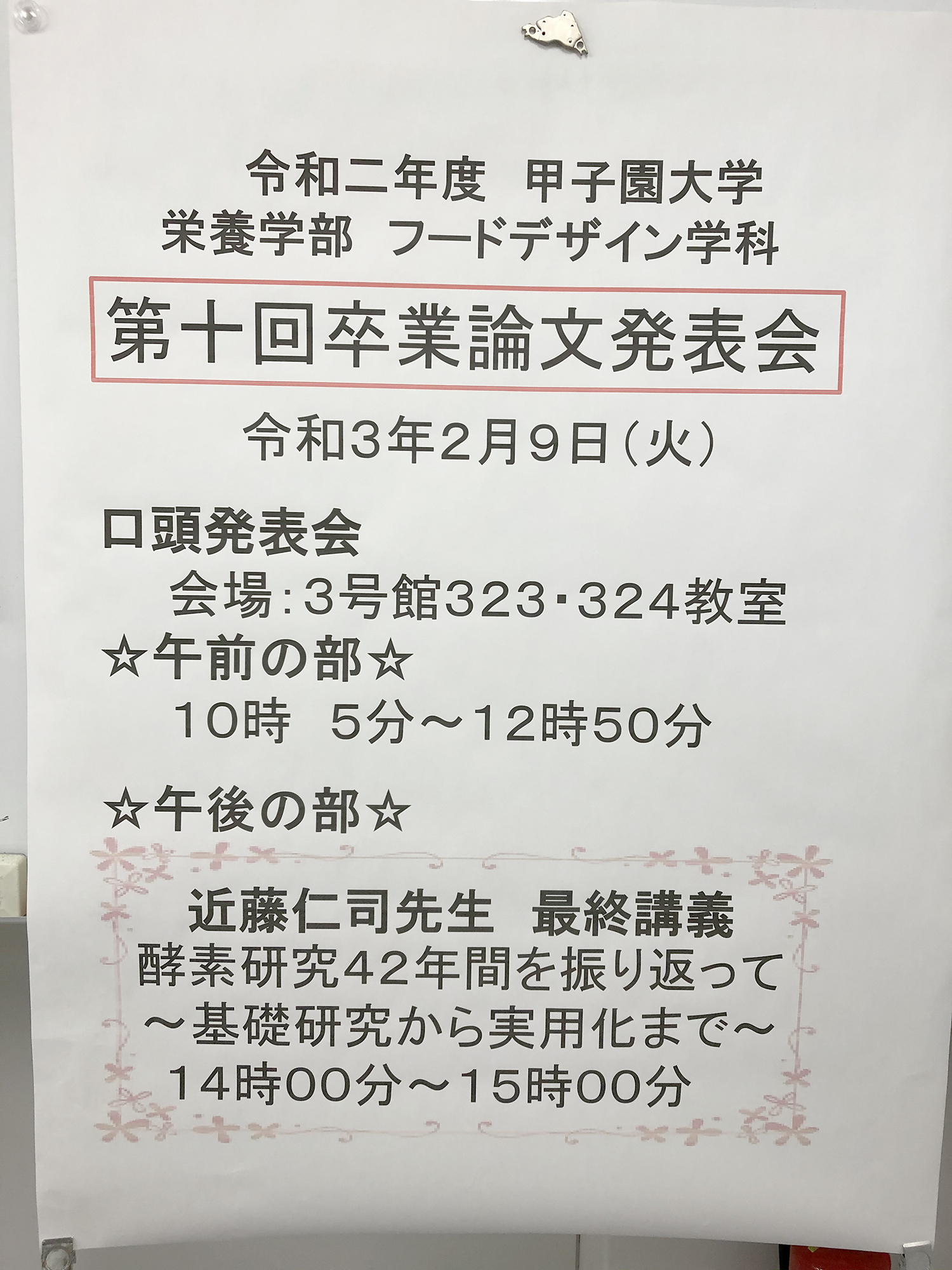 2月8日(火)に令和2年度の栄養学部フードデザイン学科第10回卒業論文発表会が開催されました。本年度は新型コロナウイルス感染拡大の影響を受けての休校もあり、卒業研究を思ったように進めることが難しかったと思われます。しかし学生たちは各研究室で先生方の指導を受けて熱心に卒業研究に取り組み、発表会ではその成果として12演題が発表されました。以下は演題の一例です。