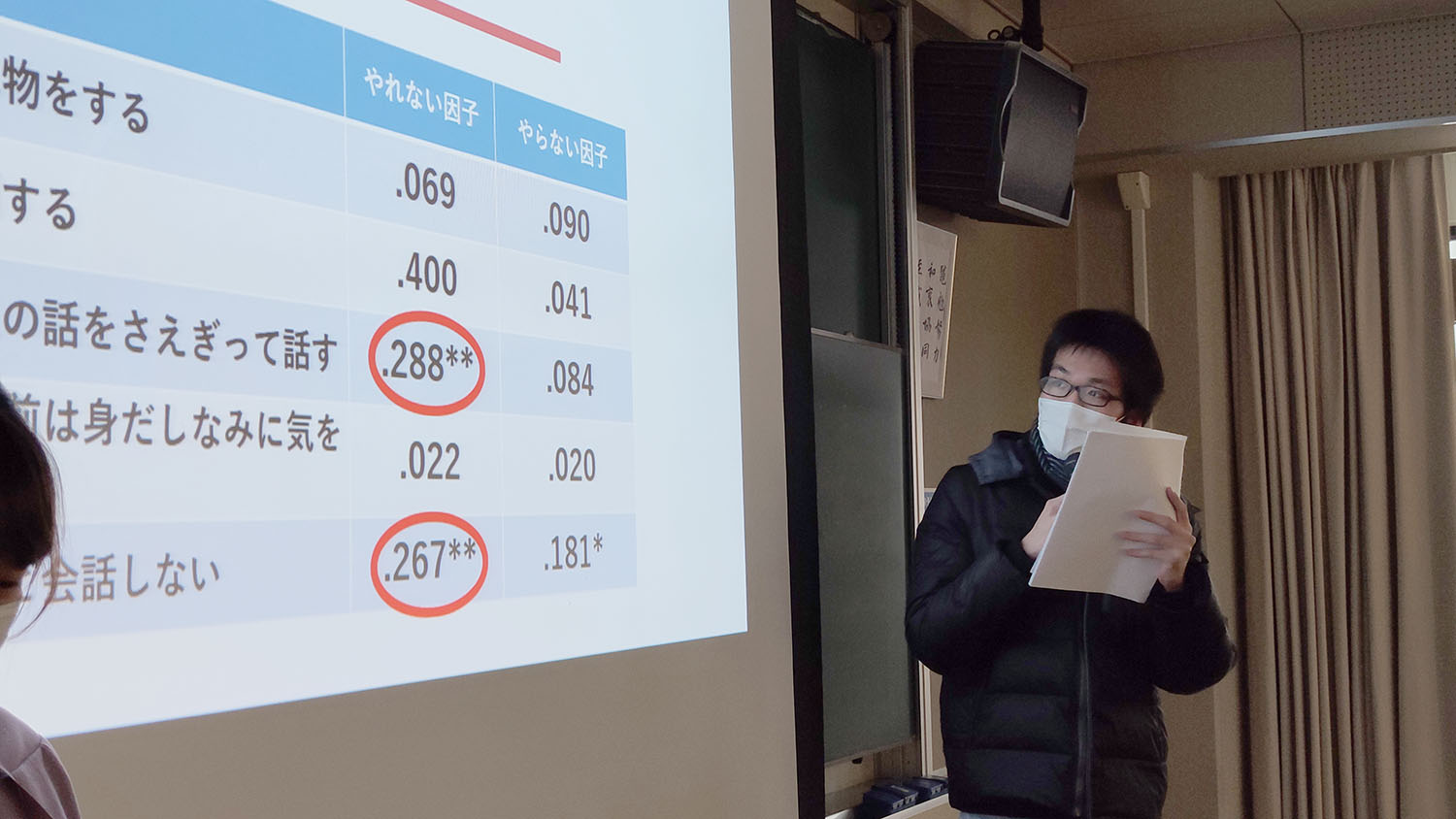 半期の間、甲子園大学の学生を対象(調査協力者と言います)とした調査を行ってきました。グループごとに特定の心理学的な尺度(心理テスト)をテーマに設定して、受講生たちが独自に考えた質問項目との相関関係を分析・考察しています。これらは3回生の授業、そして4回生での卒業研究において、重要な基礎的スキルとなります。