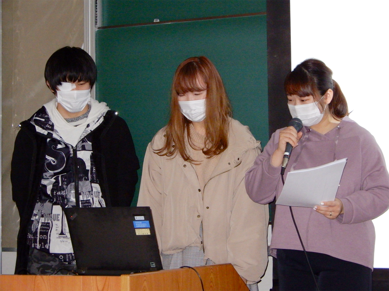 「心理学研究調査法(心理学研究法1)」は、グループワークで調査研究を行う実習授業です。写真は最終回のもので、グループごとに調査研究の成果を発表しています。受講生は2回生が中心です。調査研究を行うのは初めてにもかかわらず、どのグループも上手にまとめ、発表を行っておりました。