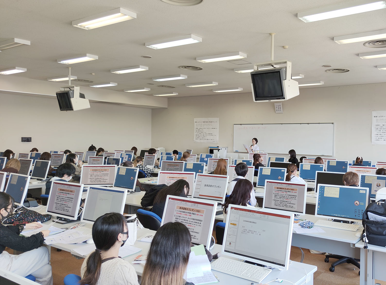 栄養学科・フードデザイン学科では、食事調査実習という授業を行なっています。この実習は、管理栄養士・栄養士を目指す上で非常に重要な科目です。なぜなら、個人または集団の摂取したエネルギーや栄養素は、食事調査を行わないと知る事ができないからです。そのため実習では、様々な食事調査の方法を学生自ら実践することを通じてその特徴を体験し、学びます。また、得られたデータを用いて、日々の食事の変動を知ったり、どの調査方法が対象者に向いているかなどを考えたりする事で、食事調査方法のメリット・デメリットを知る事ができます。