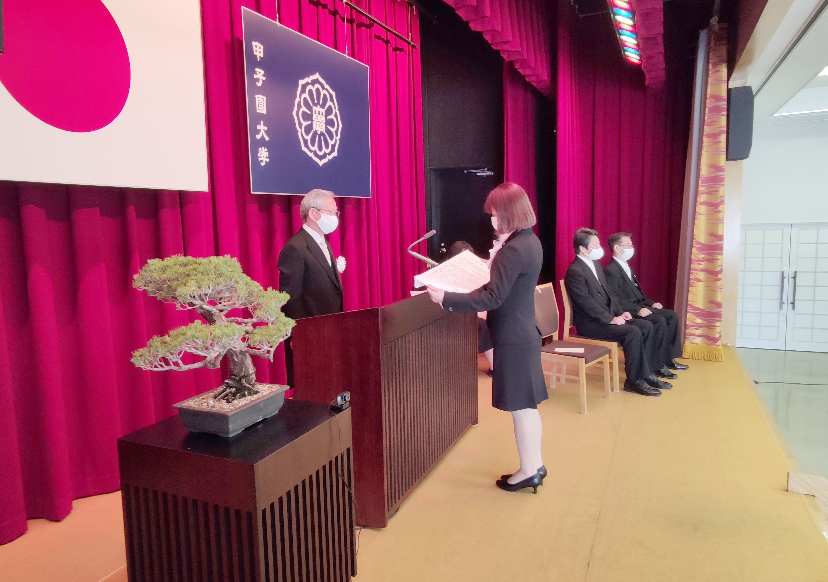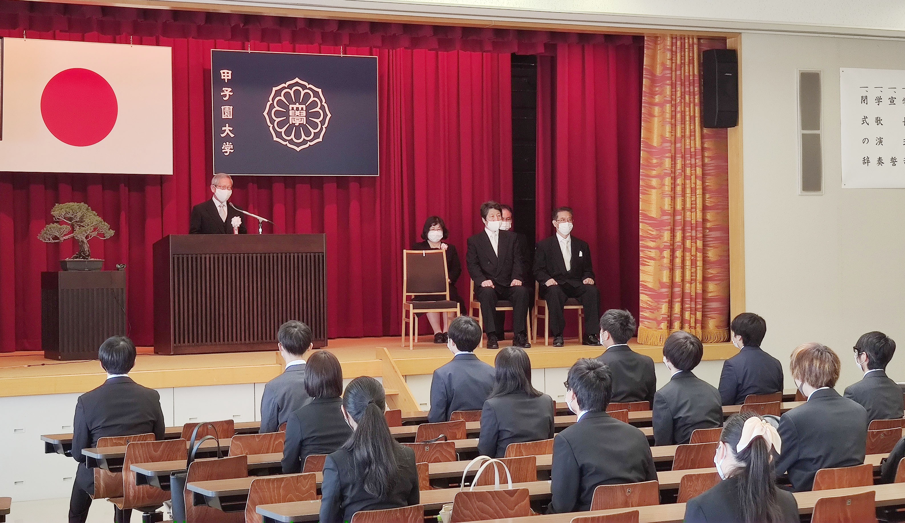 お知らせ2021.04.6 【お知らせ】令和3年度入学式を開催しました。 4月6日(火)、令和3年度甲子園大学入学式を3号館大講堂で挙行しました。 今年度は感染予防対策を踏まえ、新入生のみの出席となりました。 佐久間春夫学長が式辞を述べ、続いて新入生代表の栄養学部持永未来さんが宣誓を行いました。 新入生は緊張のなかにも、期待に満ちた表情で式典に臨みました。 式典終了後には、佐久間学長から今年度の大学役職員の紹介が行われました。 新たな学生生活がいよいよスタートです。 発信部署:事務局 « 前の記事へ 次の記事へ »